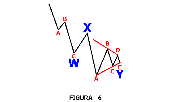 En el caso que nos ocupa, mi idea parte de una formación compleja del tipo Triple Tres (a las que yo suelo etiquetar como W-X-Y-X-Z), y aunque este tipo de formación puede cobrar diferentes aspectos, entremezclando ondas Planas, Zigzag y Triángulos, sin embargo dada la actual estructura, sólo pueden producirse dos modelos: bien un Triple Zizgag, o bien una Triple Combinación.