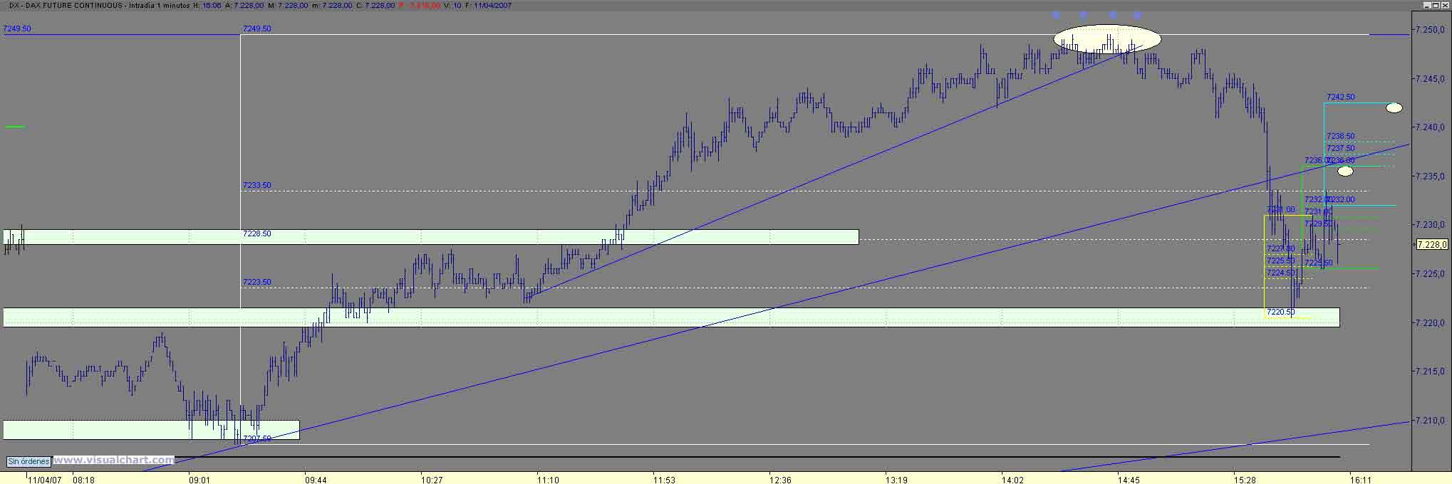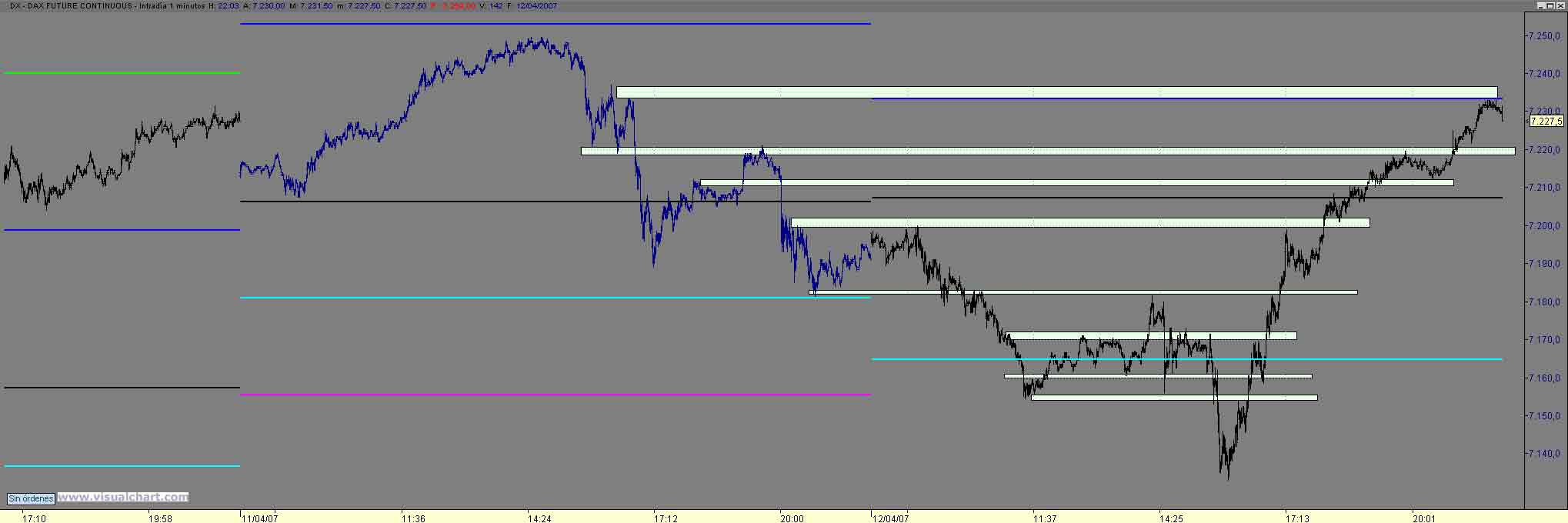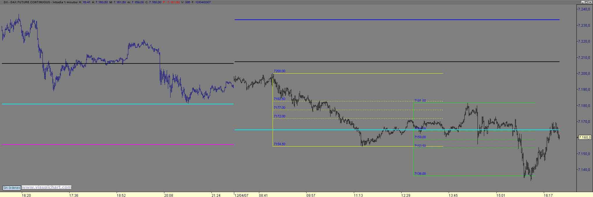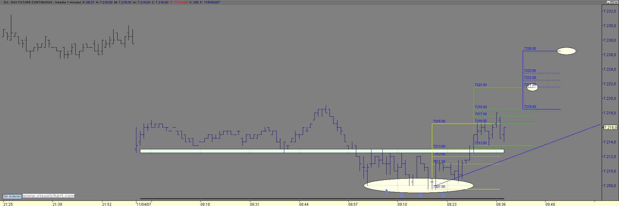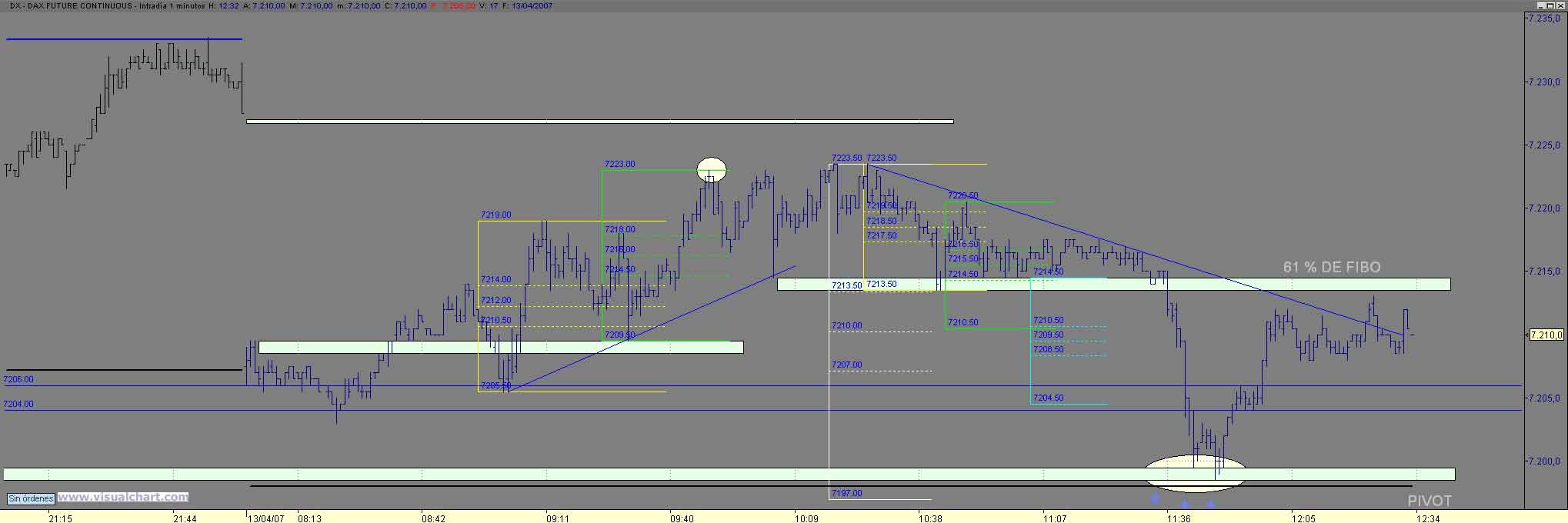 B dias señores tras el atracon alcista de ayer nuestro amigo el Dax nos dejo el siguente cuadrito de niveles de control facilmente identificables , la apertura por encima del 200 203 invito a unos larguitos que como primer nivel de llegada estaba logicamente en el siguiente es decir el 19 21 y en su retro de jo un bonito 61 % de Fibo en 7209 y zona de maximo intradiario anterior donde nuevamente apostamos por largos buscando su proyeccion al nivel del 26 27 que es coincidente con el cierre del gap matinal Un saludo