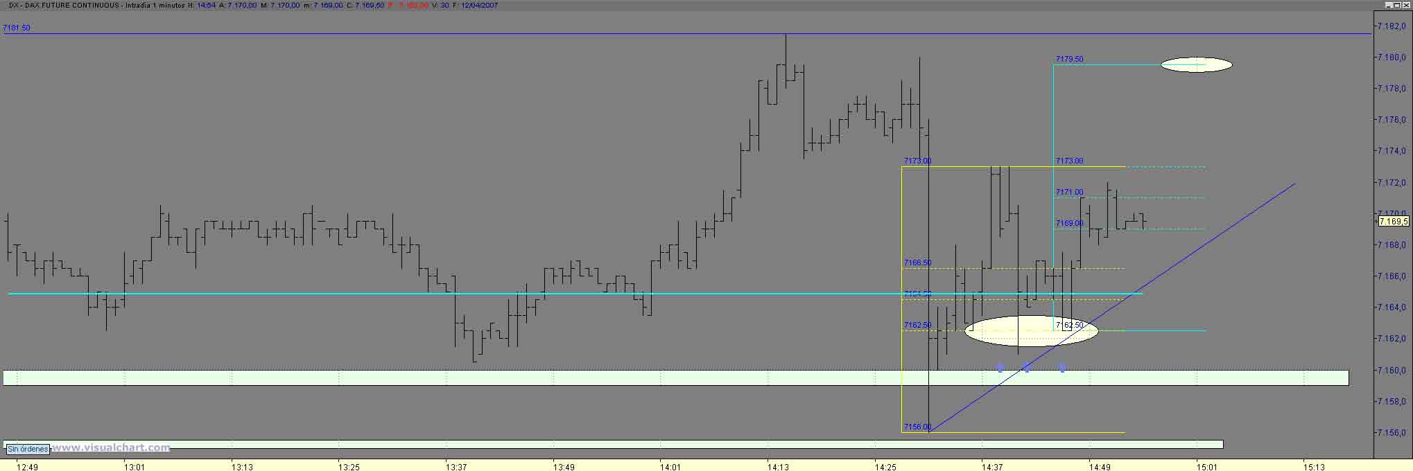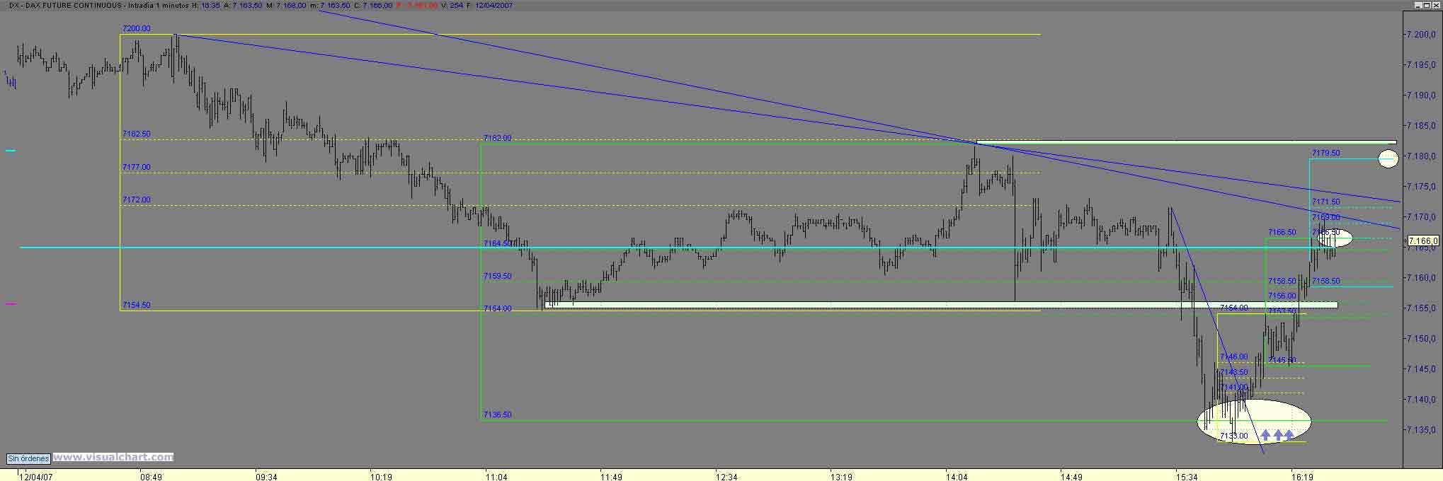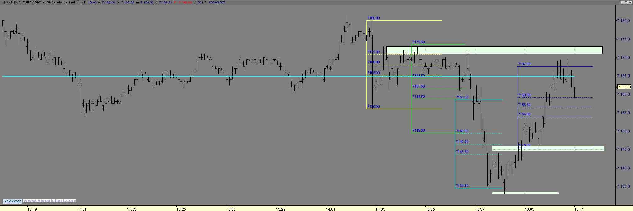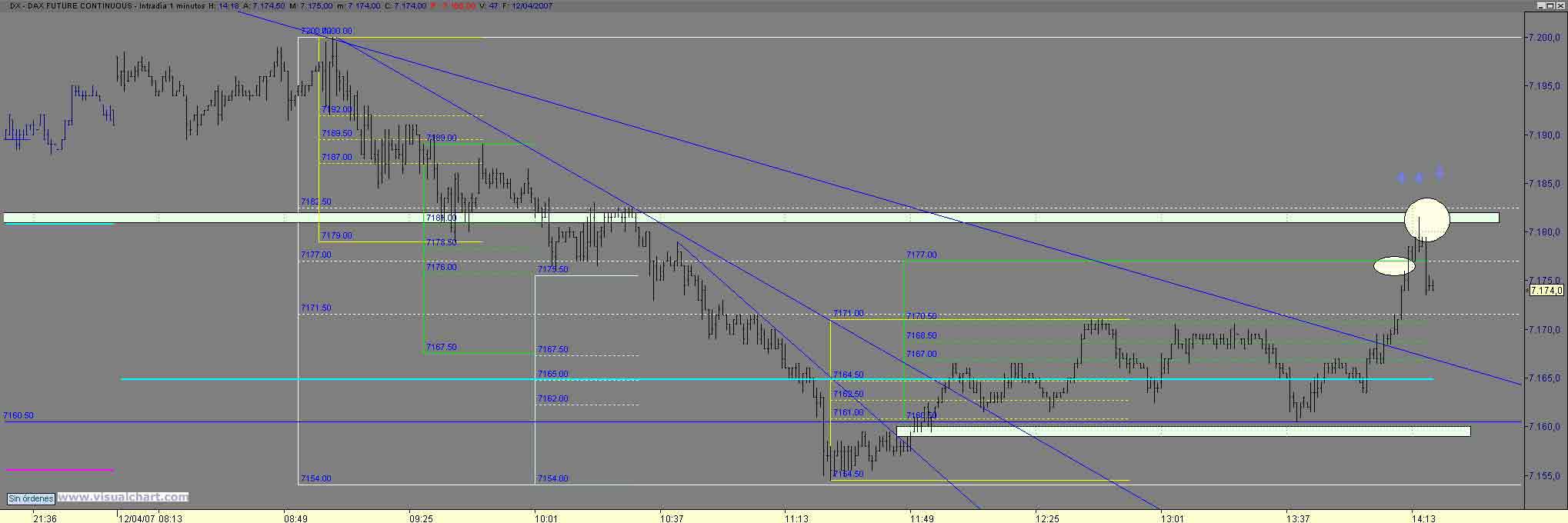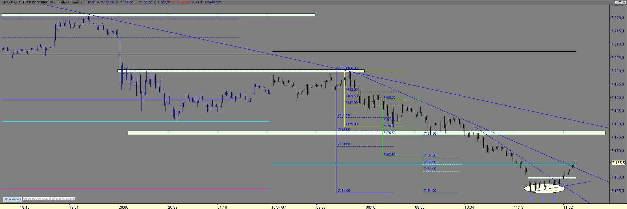 B dias señores tras el atracon alcista de ayer nuestro amigo el Dax nos dejo el siguente cuadrito de niveles de control facilmente identificables , la apertura por encima del 200 203 invito a unos larguitos que como primer nivel de llegada estaba logicamente en el siguiente es decir el 19 21 y en su retro de jo un bonito 61 % de Fibo en 7209 y zona de maximo intradiario anterior donde nuevamente apostamos por largos buscando su proyeccion al nivel del 26 27 que es coincidente con el cierre del gap matinal Un saludo
