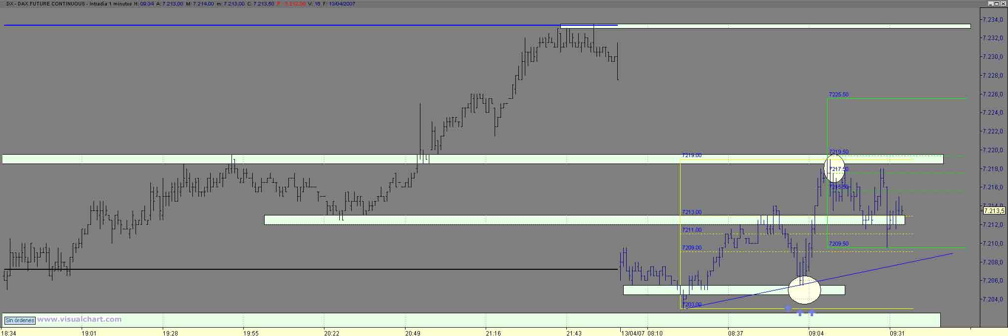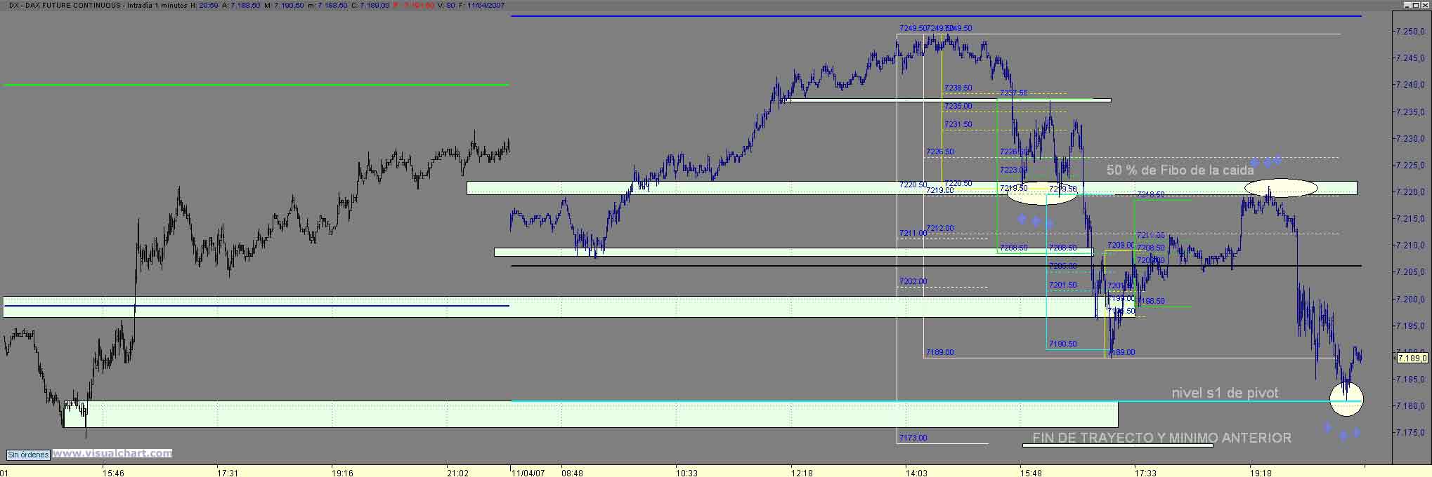 B dias señores tras el atracon alcista de ayer nuestro amigo el Dax nos dejo el siguente cuadrito de niveles de control facilmente identificables , la apertura por encima del 200 203 invito a unos larguitos que como primer nivel de llegada estaba logicamente en el siguiente es decir el 19 21 y en su retro de jo un bonito 61 % de Fibo en 7209 y zona de maximo intradiario anterior donde nuevamente apostamos por largos buscando su proyeccion al nivel del 26 27 que es coincidente con el cierre del gap matinal Un saludo