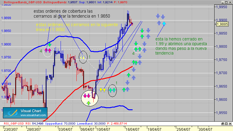 Esta estrategia con ese rango entre lineas de 50 pipas en GBP-USD, en mi opinion hay que trabajarla en grafica de 4 horas tomando los rangos de bollinger y sus pautas como sistema guia con un indicador como filtro para detectar los giros en las fases iniciales de cambio de tendencia y tomando la gragfica diaria como base para no ir contra esa tendencia, aplicado a otros pares de divisas hay que estudiar el rango diario, volatilidad y rango entre lineas ajustado a los soportes-resistencias..