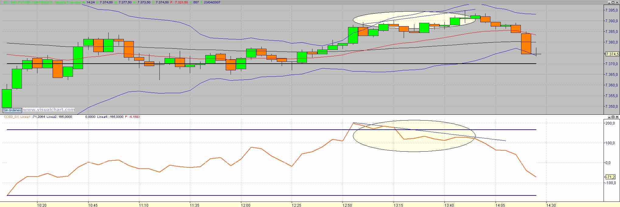 Nuestro querido Dax no nos da tregua y tras alcanzar el obj señalado en 91 (anda que el que no se haya subido no sera porque no le ha dado oportunidades) y tras romper esa direztriz que llevaba desed el lateral del 64 75 y tras perder el nivel del 89 ultimo maximo antes de ese obj de 91 desarrolla tres estrcturas a la baja apoya en la diverg en 5m con onj 80(1) 74.50 (2) posible extension al nivel del 7371 zona de pivot y 50% de Fibo de la subida desde el nivel del 7345.50 Un Saludo