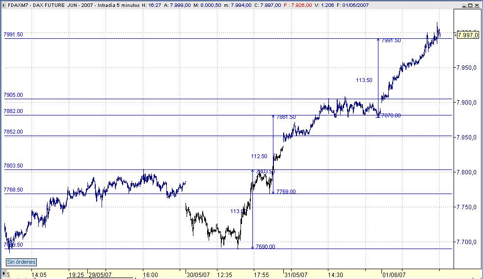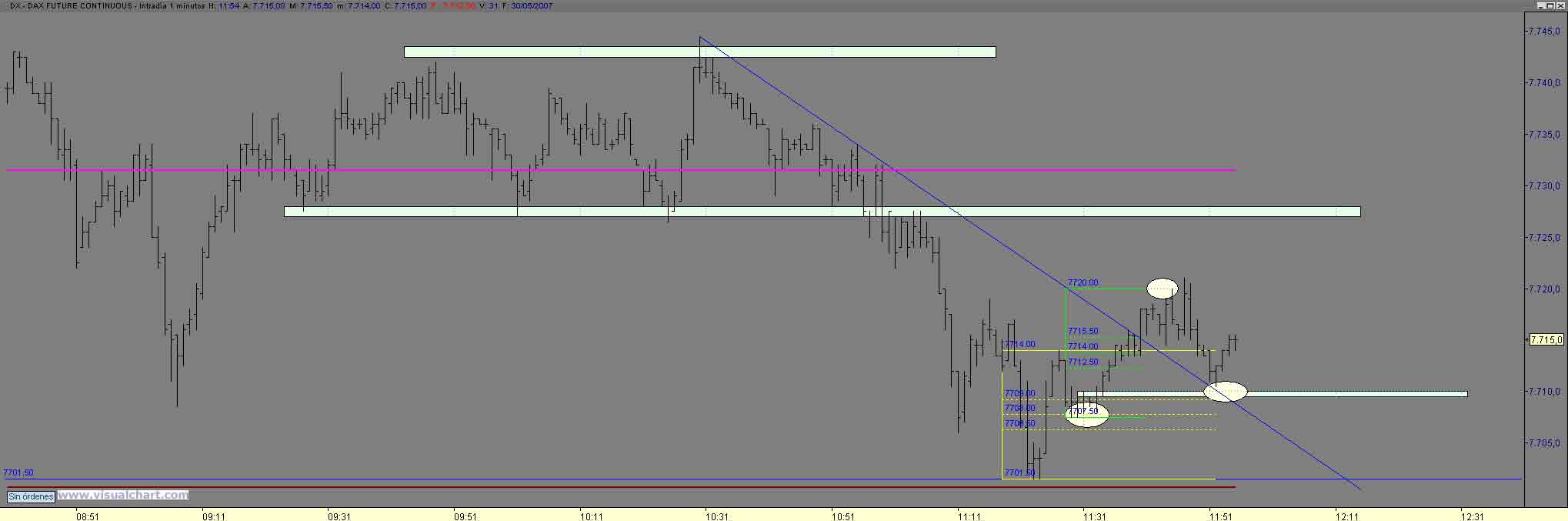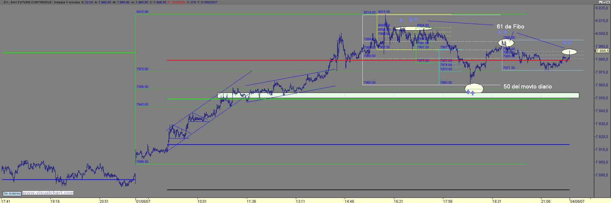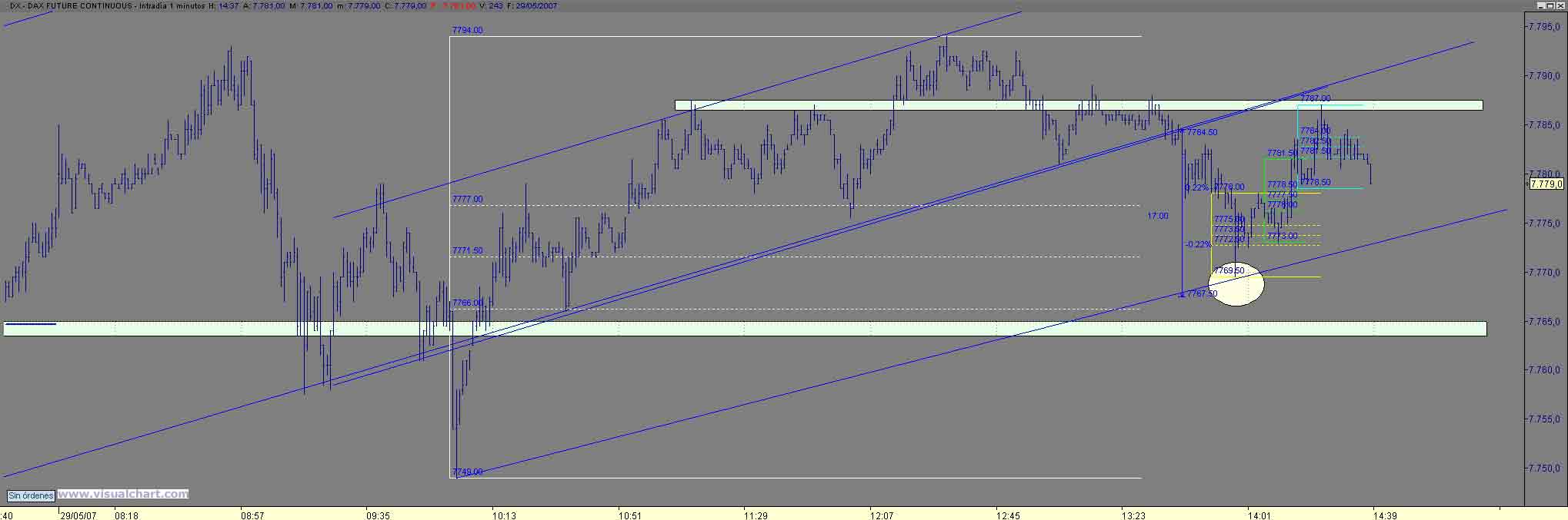 Muy buenos dias descansados deel largo puente bursatil nuestro amigo el Dax quiso reencontrarse a buscar sus amximos anteriores 7794 desde donde sin superralos se deslizo en tres impulsos al nivel del 59 61 coincidente con la direztriz alcista que traemos desde el doble suelo del 7674 donde tomar posiciones largas con obj inicial el 50 61 de Fibo de toda la bajada el 7775 80 y zona de control anterior Saludos