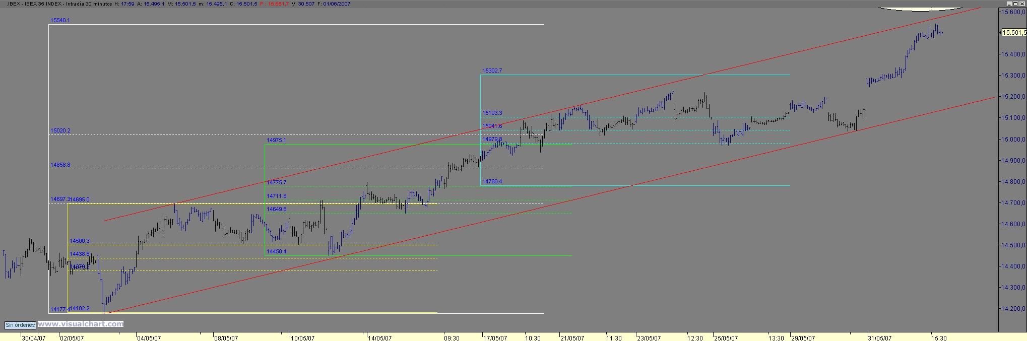 B dias de regreso de las Bermudas os dejo las peripecias de nuestro amigo el Dax , eso si a toro pasao aunque tampoco difiere mucho de lo habitual de los cuadritos, arreones alcistas y mas arreones y ante eso sin uan correccion decente solo valen pullback a ressitencias y seguimiento de direztrices , el viernes en concreto hasta bien entrada la tarde y ya con los Usa solo se produjo esa correcion al 50 de Fibo del movto diario en tres impulsos al clavaos, con posteriores paradas en los 61 de Fibo de los movtos precedentes , tambien os dejo (aunque no opero en el) el Ibex en movt de mas largo tiempo y el movto posterior desde su parada en el 61 de Fibo Saludos y a disfrutar