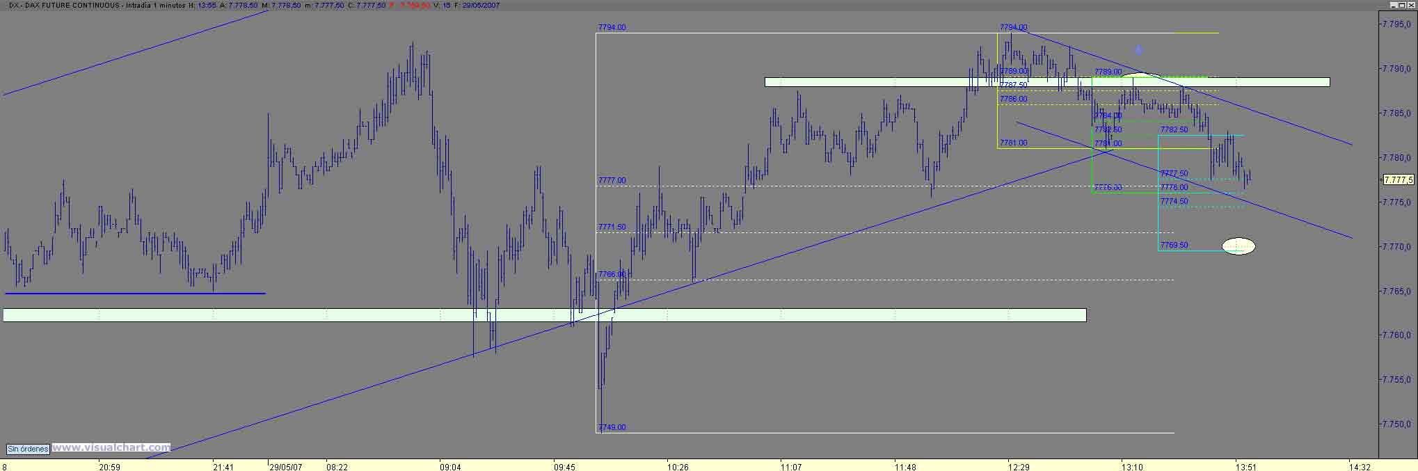 Muy buenos dias descansados deel largo puente bursatil nuestro amigo el Dax quiso reencontrarse a buscar sus amximos anteriores 7794 desde donde sin superralos se deslizo en tres impulsos al nivel del 59 61 coincidente con la direztriz alcista que traemos desde el doble suelo del 7674 donde tomar posiciones largas con obj inicial el 50 61 de Fibo de toda la bajada el 7775 80 y zona de control anterior Saludos