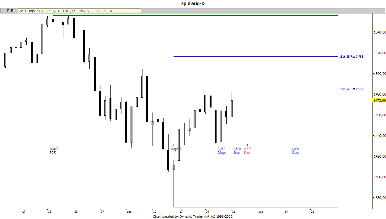 ponnos gráficos, que si no, con tanto grado cuesta centrarse. Lo que parece claro es que hemos comenzado de nuevo el descenso mientras no se superen los máximos del día 4 de septiembre. El oscilador 8-5-3 apunta para abajo en el diario.Vamos a intentar seguirlo y ver hasta dónde llega. Creo que la situación a corto plazo pinta así: hoy retroceso del descenso de ayer para empezar. Se supone que en el S&P sobre 1481-1485 será un buen punto para entrar corto. Si no, cuando rompa el mínimo de ayer será buen momento. Suerte.