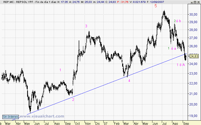 En el gráfico diario, parece que REPSOL ha cortado la línea 2-4 de la Onda 5, (en color fucsia), que parece ser la última de la subida que se inició en Mayo de 2006, (Onda 4 en color negro), sobre los 19, 50 Euros.