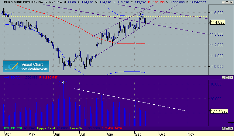 En el Bund tenemos una formacion en cuña acompañada por decrecimiento del volumen , una fuerte resistencia en los niveles de 114.60 , la principal directriz bajista y la banda bollinger superior, actualmente apoyado en la directriz alcista y base de la cuña y soporte menor en precio apx en 114.