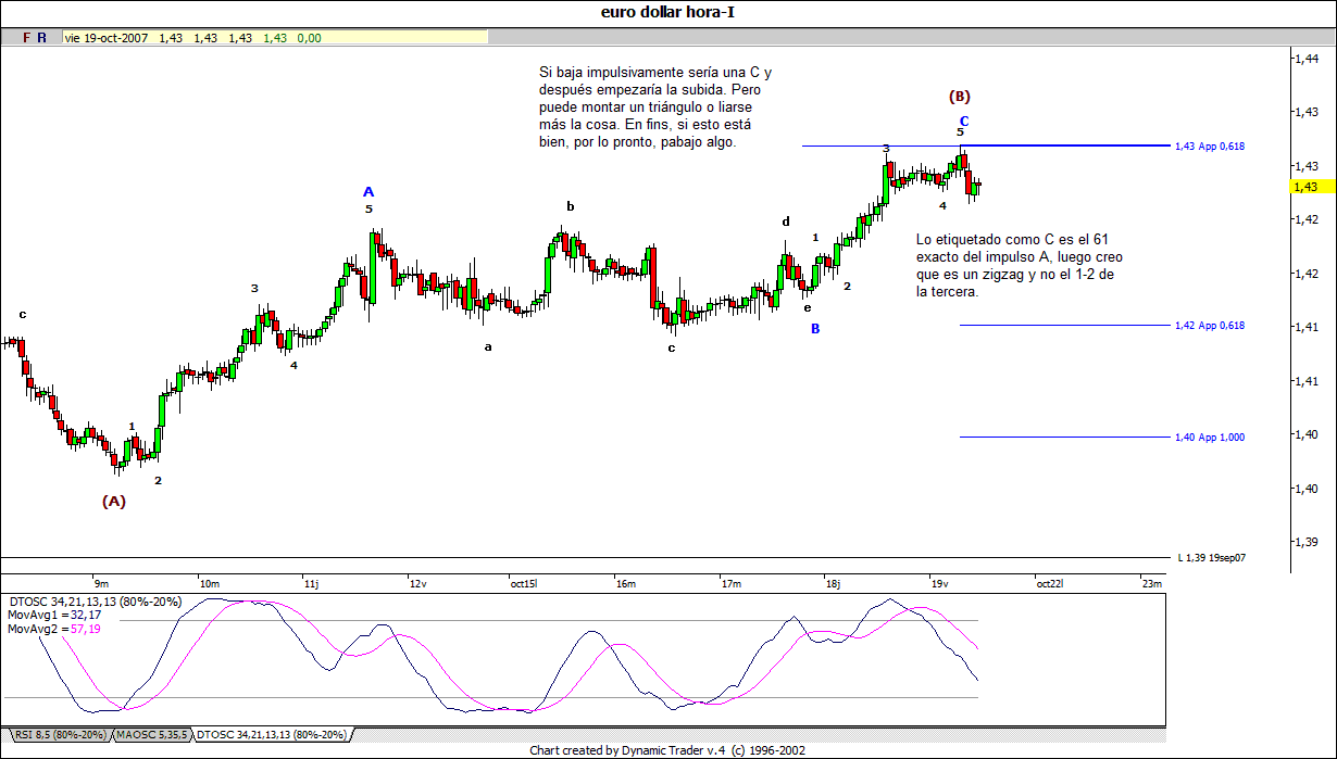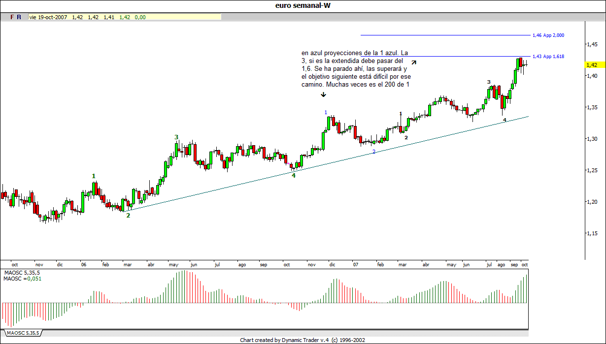 Me he puesto a zarzetar con el largo plazo del euro y está siguiendo todas las pautas ordenadamente. Se adivina un gran techo en el mensual, pero claro aún queda. La última subida en principio podría parecer una onda b por su poca aceleración, pero creo que viendo cómo van las cosas es la 5 y última. Está creando la divergencia típica de 5. Zoomeando en el semanal, vemos que aún queda. y estamos acabando la 3 de esa 5. Cuando acabe la 3, a la que le pueden quedar solo días, la bajada será considerable. Si supera el 1,43 habrá que estar al loro de un día que cierre por debajo del mínimo del día del máximo. Para arriba ahora aún hay recorrido, pero no mucho. Amás amás no tengo claro todavía si esto es un impulso o una onda b hasta que no supere el 1,43 claramente y pa entonces mejor esperar el patapumpabajo.