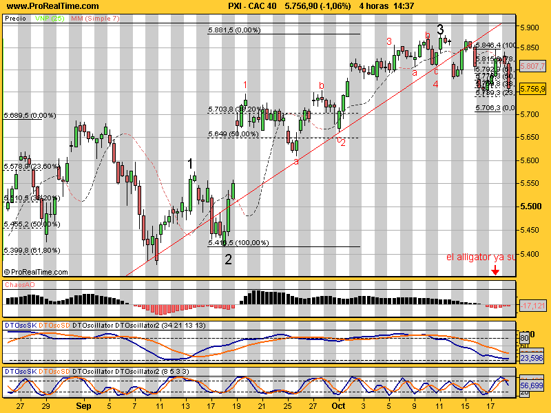 A mí todo me da cuarta onda, no pabajo pabajo. Lo que tienen estas jodías es que como corresponden a momentos de indecisión, pues despistan un webo: que si ahora bajo, ahora parece que despego. En fins, que pongo el Cac, que me parece que queda un trecho, pero no mucho pa tocar suelo. :? Extendió la onda 1 de esta tercera y toca retroceso hasta la 2 que es donde empieza a estar. Cuando se extiende la primera empiezan a salir formas extrañas porque no es lo usual y he estado lerdo como un vurro y no me enterao. Pero nunca es tarde, esto es como el júrgol, enseguida tendremos ocasión de resarcirnos porque la subida no será despreciable. Todo sea que ahora se vaya todo pabajo en serio, mas no creo bellaco. :-D