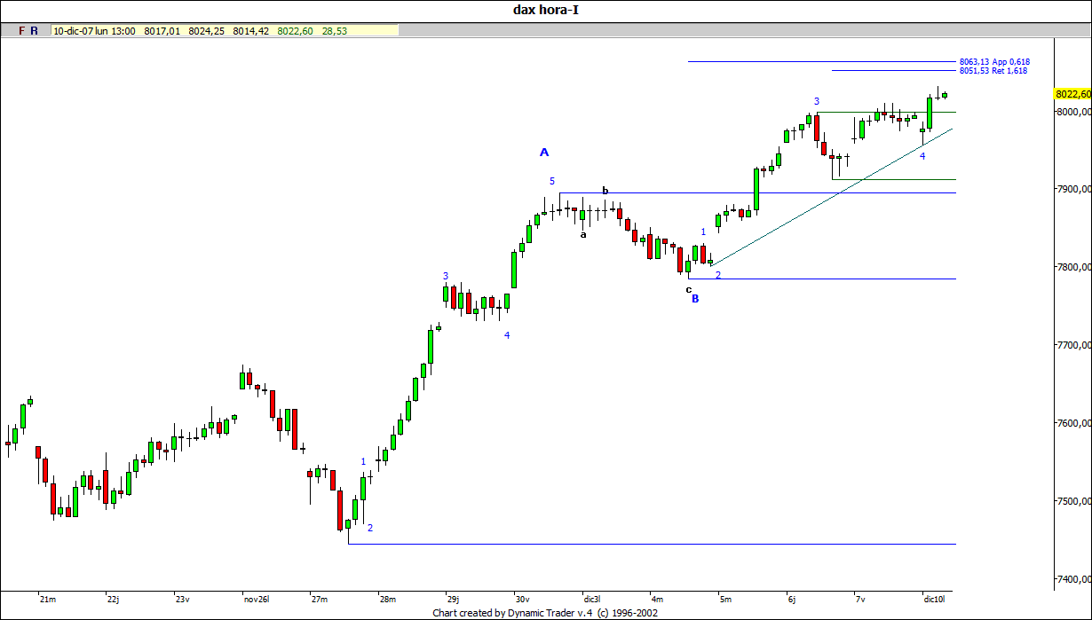 ). Me he liao a supervisar una hipótesis de impulso en el dax en lugar de abc dada la subida de hoy y a partir de ahí he mirao el dow, que hoy ha completao un abc evidente (la bajada de ayer es exactamente igual a la de hoy) y conforme revisaba las cosas más alcista me parecía. He llegao a la conclusión de que el ascenso reciente es la onda 1 al alza. Si esto es cierto y ahora viene la tercera nadie que quiera ganar unos dinerillos debería quedarse fuera. Habrá que ver cómo evoluciona, pero en el dax no es muy difícil de pillar: como la extendida ha sido la subonda 1, el retroceso ha de llegar hasta el área de la subonda 2. El final de esta anda por el 50% de retroceso. Me parece que se acaba por fin este vaivén. Hale, a verrrr....