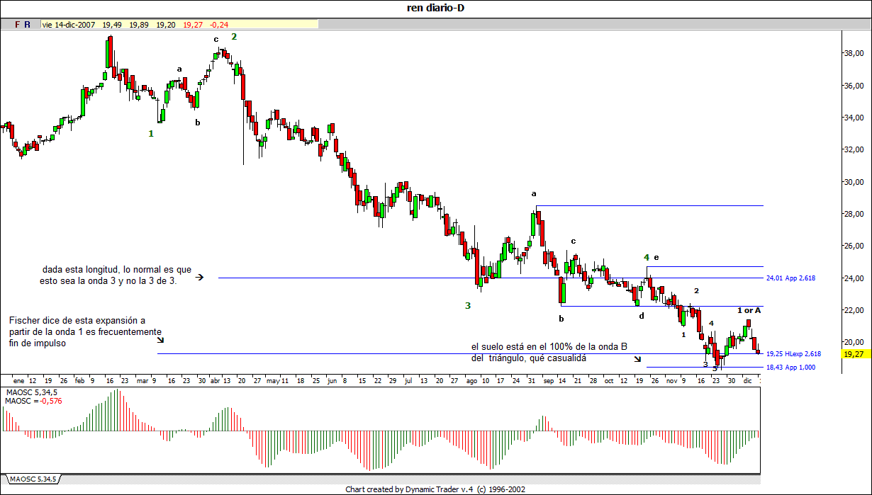 Dado que uno no oye sino noticias desastrosas y mal rollo financiero, creo que la cosa va así y que igual el ibex no baja de 14000points en toda nuestra vida. Pero vamos, que todo esto es muy divertido, pero lo mejor es operar según el movimiento que vemos en el gráfico diario y no pensar nunca que nuestro recuento es perfectamente glorioso, sino en qué instante cambiaríamos de opinión. Creo que uno de los problemas que puede ocasionar la onda de Elliott es que creamos que estamos en tal o cual fase y previendo un movimiento inevitable nos megapalanquemos y nos demos cuenta de que estábamos equivocaos con la cuenta a 0€. U sea que no vale el "esto es así", sino que necesita un "mientras no..."para completar el sentido. Es lo de los recuentos alternativos que todo el mundo echa en cara como un defecto de la teoría de la onda. Pero en realidad no es un defecto de la teoría, sino un defecto del analista, que sabido es que es imposible que sea prefrectro.