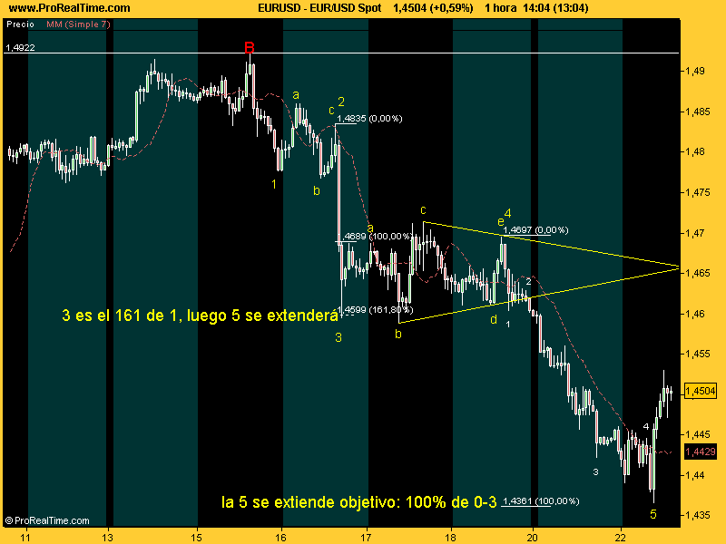 Ná, que se acelera menos que el primer impulso, lo que no cuadra demasiao. Por eso decía que la onda C podía ser considerada un 3 y si es así lo que pasaría es que estaríamos en la D de un triángulo. O sea que no me extrañaría que se diera la vuelta en 1.4830 que es donde A=C. Si lo hace, no obstante, habrá que volver a buscar una entrada larga.