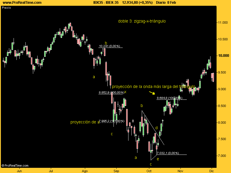 Hummm es que lo he visto y he dixo: ahí va, la teoría de Elliott tiene sus errores: una caída considerable en un índice y es en 5 ondas, u sea, un impulso sin onda b ni c ni ná. Eso en un movimiento breve, tiene un pase, pero en una corrección de tal magnitud...y como me corroía la curiosidá pues me he puesto a analizarlo y , mira por donde me he encontrao con una pauta que desde que la vi esquematizada por Neely me tenía emperrao encontrar en un gráfico de verdad (que el jodío del Neely habla de representaciones "realistas" pero no pone ninguna realfrankcis escribió: