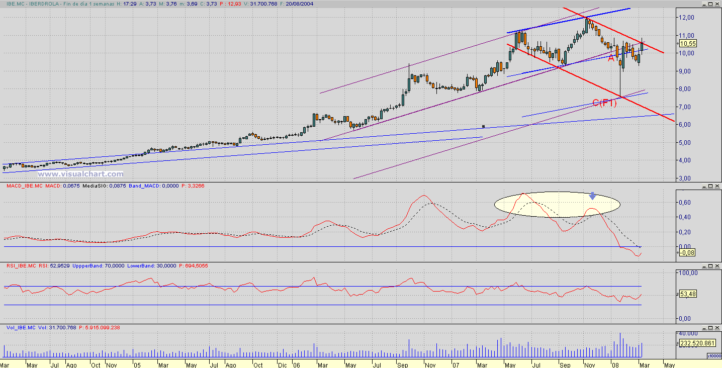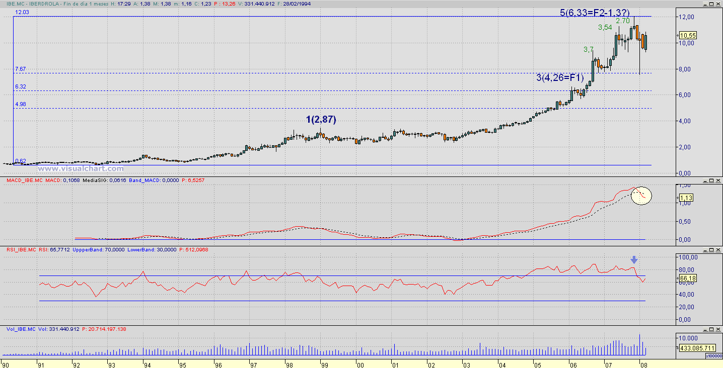 El señor caba que para mi que es un invecil o un golfo, o las dos cosas, pero que es mu simpático, tiene una teoría que sin embargo aplaudo, a saber, el corte del MACD mensual nos dice si estamos en tendencia alcista o bajista. Pues bien IBE como todas las demás está cortada a la baja y por el recorrido desde el corte pienso ke lo tiene difícil pa recuperarse tanto como pa volver a cortar pa arriva.