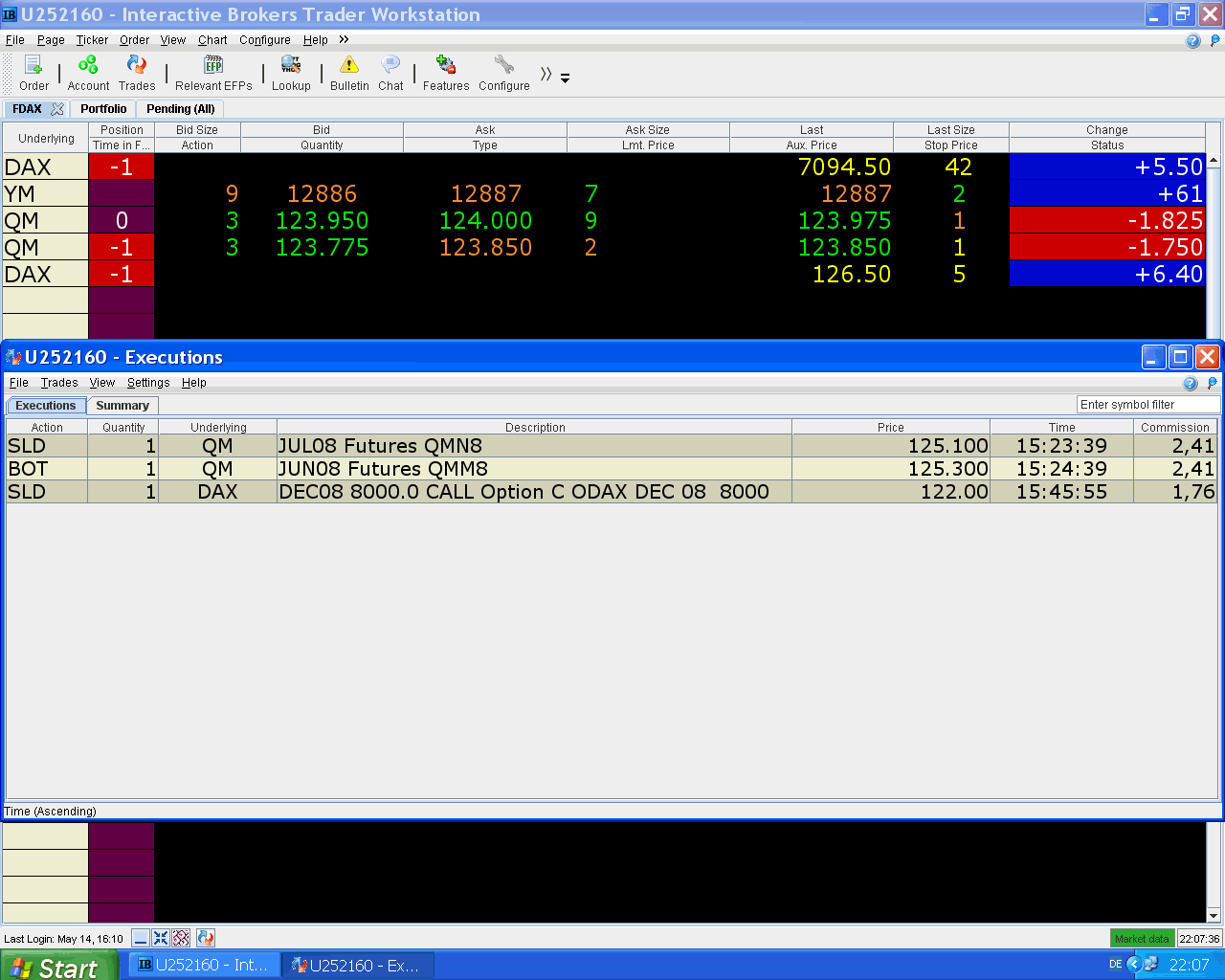 en el contrato del petróleo cambié el vencimiento de junio por el de julio, esta vez solo pierdo 0,20 $. Y además, es la primera vez que lo hago, he vendido una Opcion del DAX, 1 CALL 8000 Diciembre 2008 a 122 EUR, los 600 EUR que he recibido ya los retiré de la cuenta, son para gastármelos en cubalibres en las fiestas del verano que ya empiezan este mes.