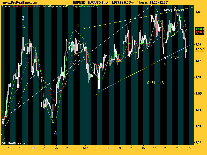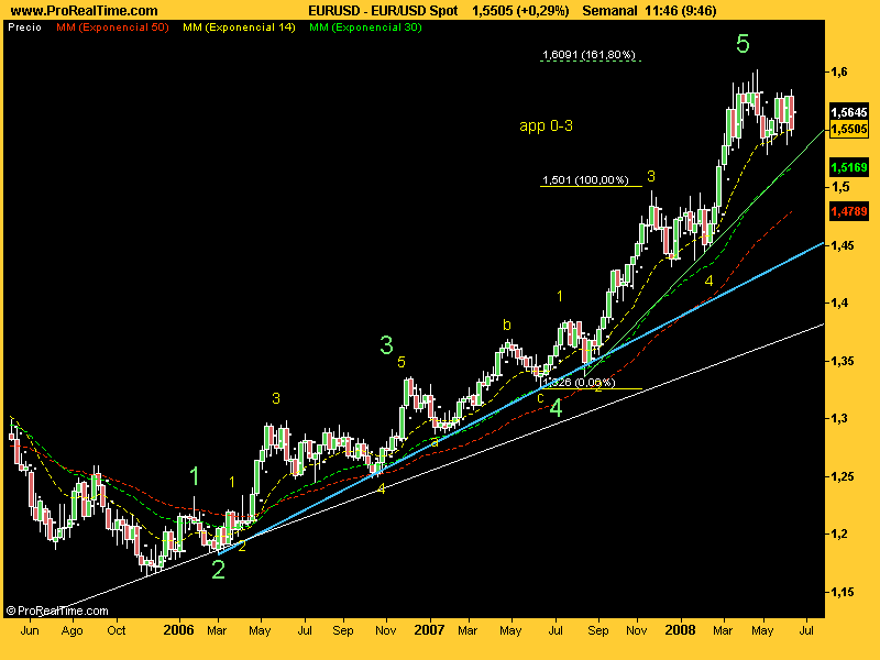 2. En el mensual queda mu claro el 1234 y que estamos en la 5. Es obvio comparando 1 y 3 que 3 es extendida. Lo normal, como digo en el gráfico es que la línea superior o bien el 61% de 0-3 o ambas cosas a la vez hubieran frenao al euro en 1.50, pero siguió, aunque una vez que estamos en esos niveles lo normal sería que no llegara al 100%