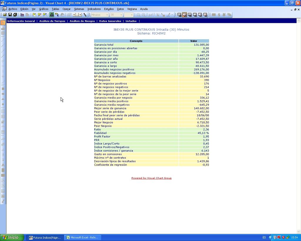 Hola, muy buenas a todos, he terminado hace pocos dias este sistema para el futuro del IBEX, en barras de 30 min, es un sistema continuo. Deciros que todavia no ha operado en el mercado real, estoy haciendo unas modificaciones para ver si lo puedo pasar a intradiario puro para el DAX, pongo la grafica de beneficios y la estadistica para que me digais vuestra opinion.