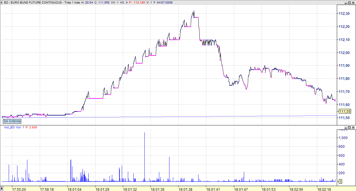 Si observas el chart en ticks veras que no ha sido una gran barrida en una sola orden, sino que han sido cientos de órdenes que conforman microcrestas y originan esa fea vela en barra de un minuto, pero en ticks hay dientes de sierra.