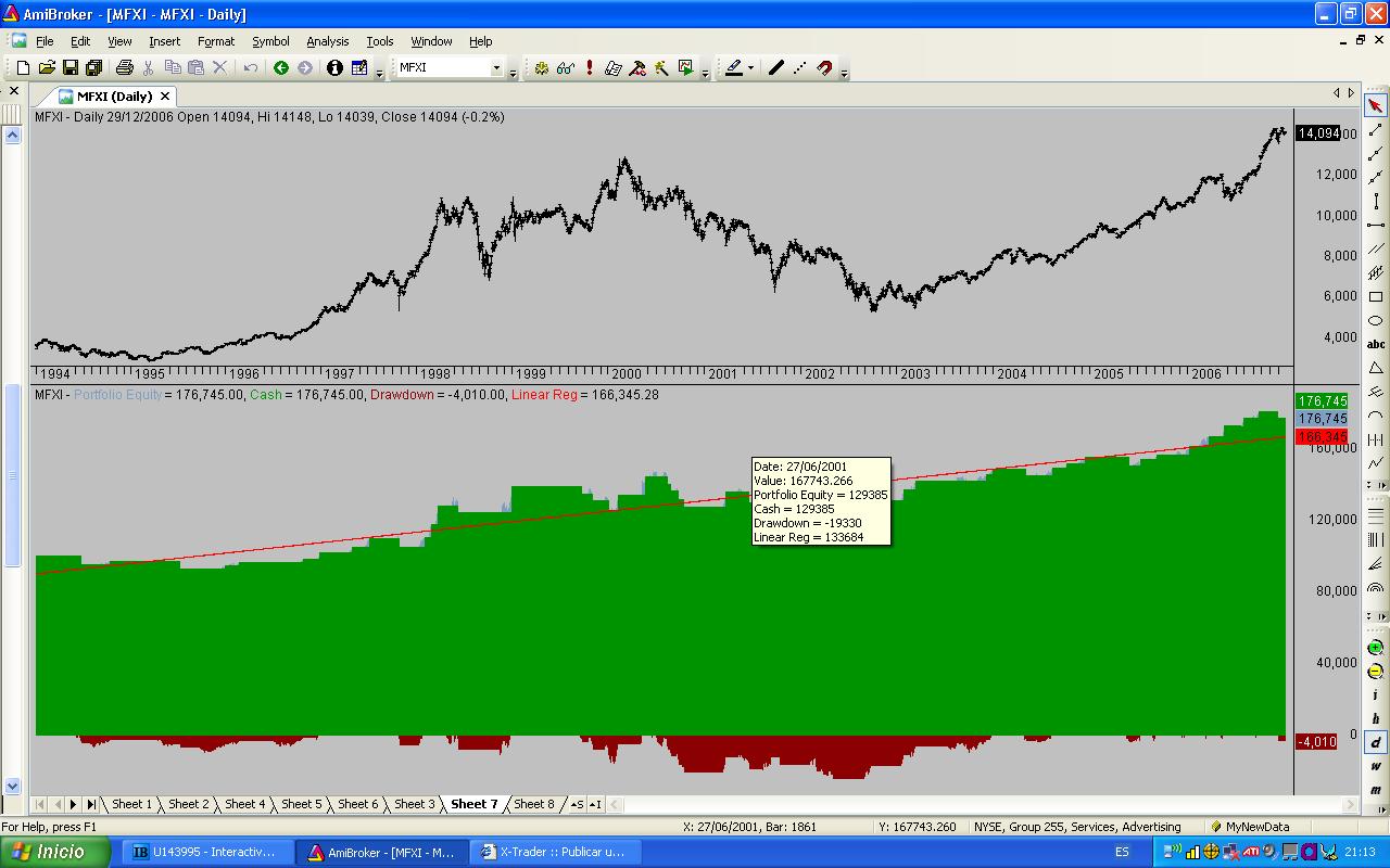 navegando por ahí me he encontrado con este sistema para Amibroker. En teoría está pensado para el IBEX en diario. Con unos ratios en 1992-2007 de: