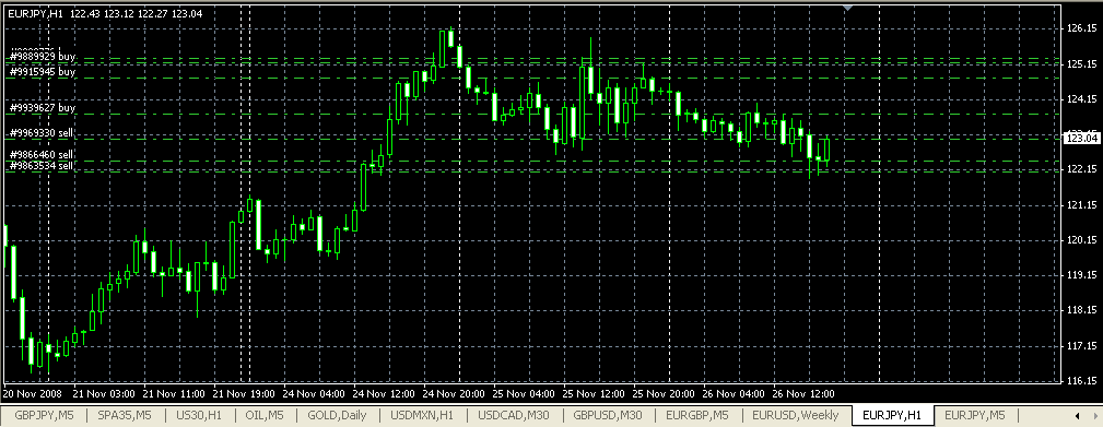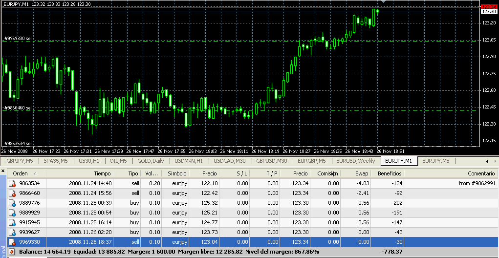 Ahora tengo un desequilibrio de -0,1 lotes. Como tengo mucho margen disponible, si el precio se da la vuelta voy a martingalear, sino tomaré beneficios de al menos 1 de las posiciones.