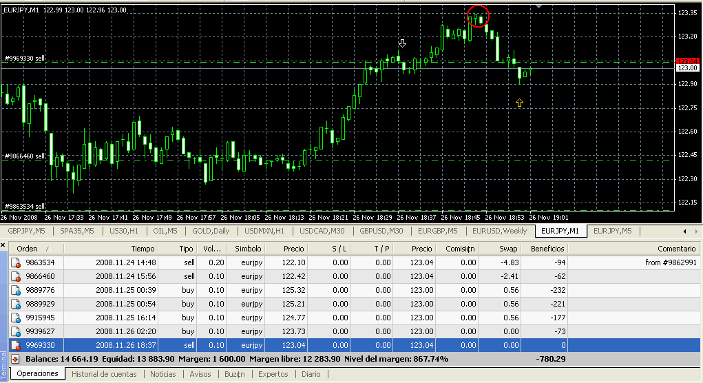 Círculo rojo: Momento en el que se perdían 30 pipos. Con otras estrategias en esa zona roja ya me debería haber saltado el stop. Esa es la diferencia principal de la cobertura.