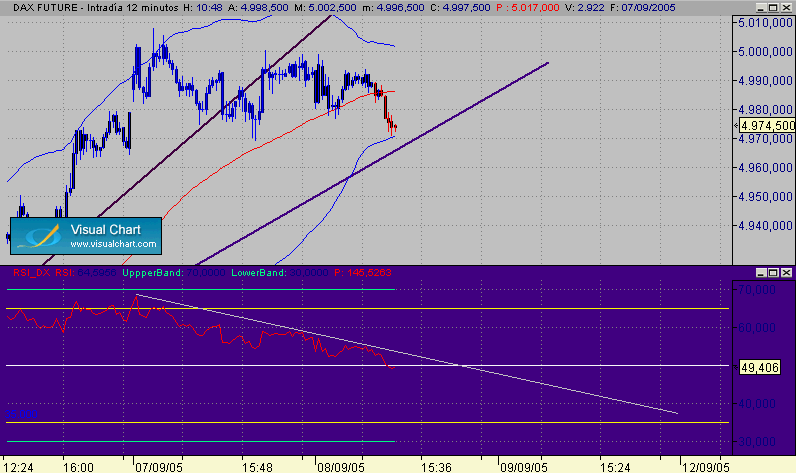 La correlacion entre el dax y el bund en los ultimos movimientos es perfecta, demasiado perfecta. El indice dow toco soporte en 10.350 impulsando los precios al alza con un 1º objetivo en la resistencia de 10.450 y posteriormente en 10.518-30. Los niveles para la sesion de mañana lunes en dax : por arriba 4937, coincidiendo con la direstriz bajista intradia,ahi comienzan los problemas, dos huecos por tapar mas arriba y fuertes divergencias que presionan los precios a la baja, probable retroceso a la zona de 4909 a la directriz alcista intra y soporte menor, segundo soporte y mas importante en 4886. El bund niveles: por abajo sporte en 123.25 actualmente con hueco por tapar que actua de soporte, en esa zona si tapa el hueco , probable retroceso a la resistencia 1ª en 123.40 coincidiendo con directriz bajista intradia, 2ª resistencia en 123.60, mas arriba la directriz bajista de maximos. Fuertes divergencias bajistas en graficas diaria, de perder el soprte en 123.25 el siguiente esta en 123 y la directriz . Saludos y buena semana