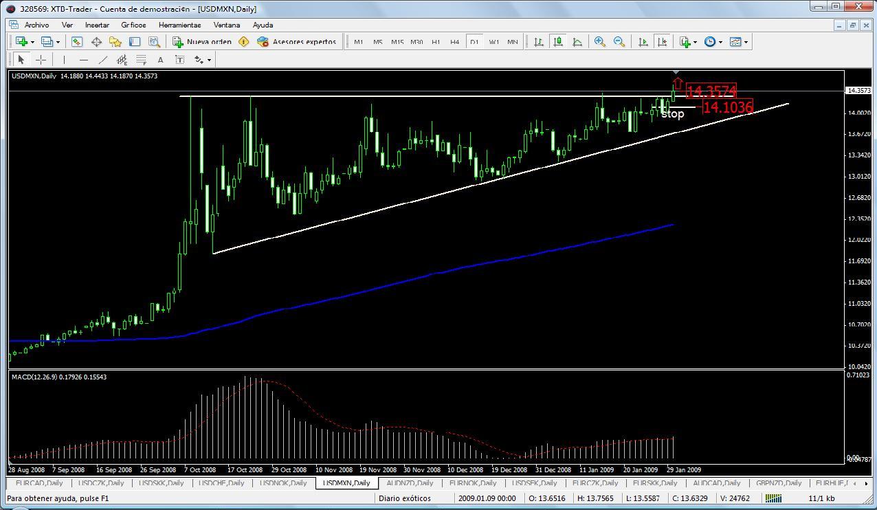 Ahora si que es una señal de entrada largos, muy clara y con alta probabilidad de exito, la vela del viernes a roto la linea de tendencia, o de la parte superior del banderin.Es una señal IDENTICA de otro caso que se dio en el eur/usd en grafico Diario hace un año o algo mas, aproximadamente.