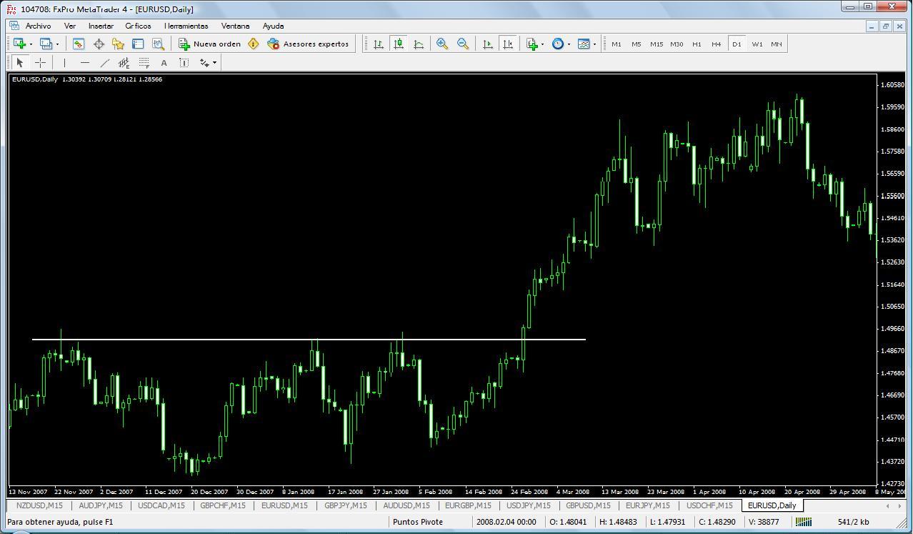 En el euro usd, hace un año aproximadamente, estubo 3 meses o mas en tendencia lateral, del estilo de esta operacion, y rompio muy agresivamente, aunque en este caso no a roto exactamente igual, pero bueno yo tengo el stop por debajo de la vela que rompio la resistencia, y segun el analisis tecino, las resistencias cuano son rotas, pasan a ser soportes, ya veremos que pasa.