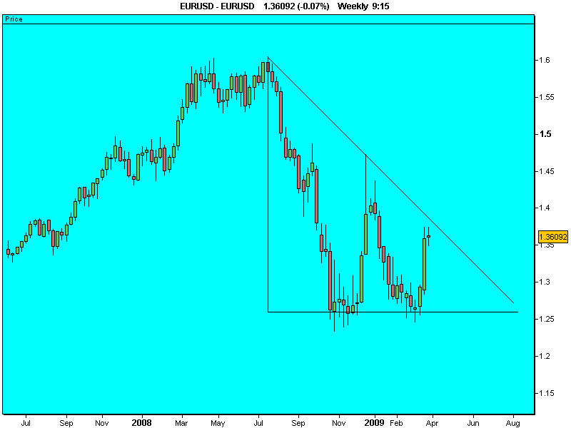 Un gráfico muy bueno, sin duda alguna si se confirmara ese gráfico la tendencia cambiaría de forma fuerte y estable en el tiempo, o sea, que el euro caería bastante confirmando una tendencia bajista a medio plazo, es bastane posible.halconx escribió:Hace algún tiempo que le tengo echado el ojo al EURUSD y últimamente me ha dado por pensar que va a tener una fuerte caída al estilo de lo que ha sucedido con los índices.