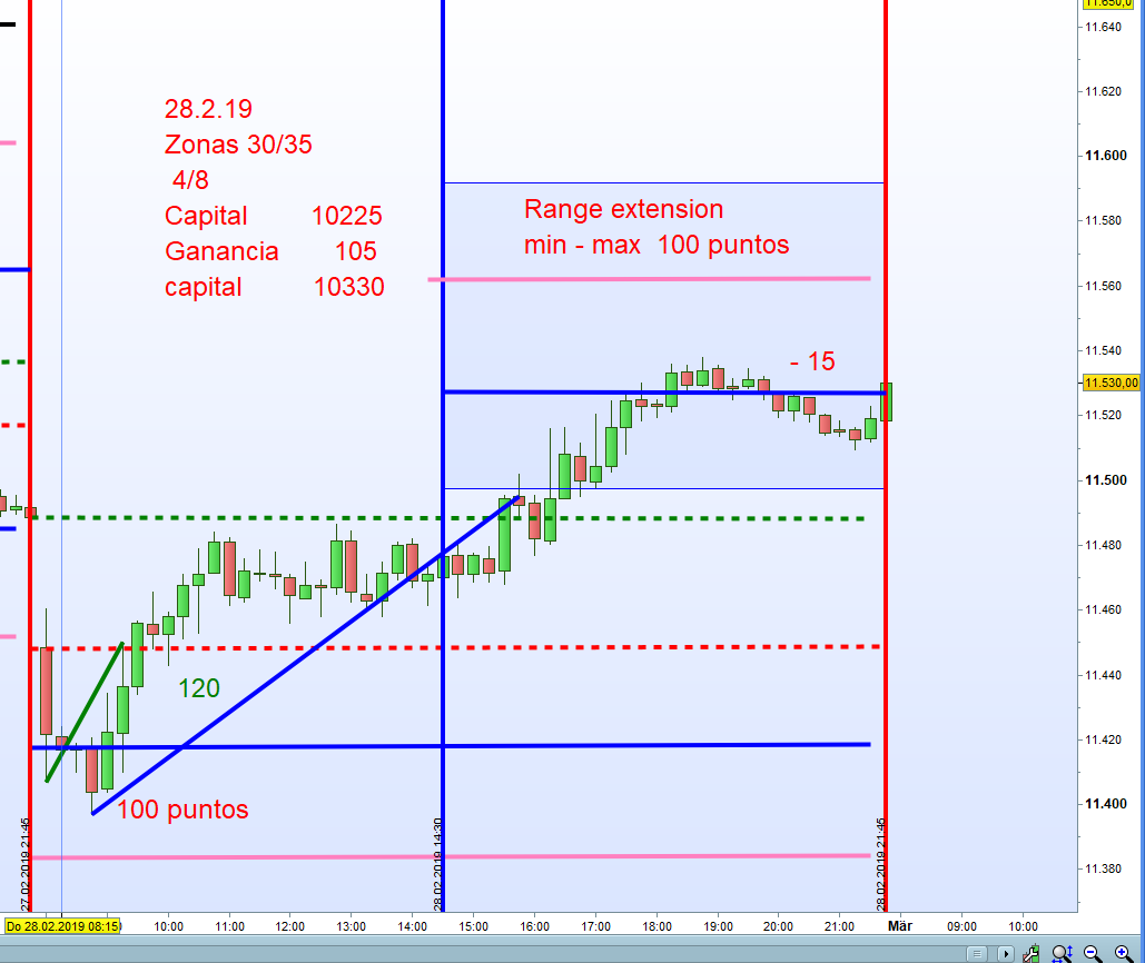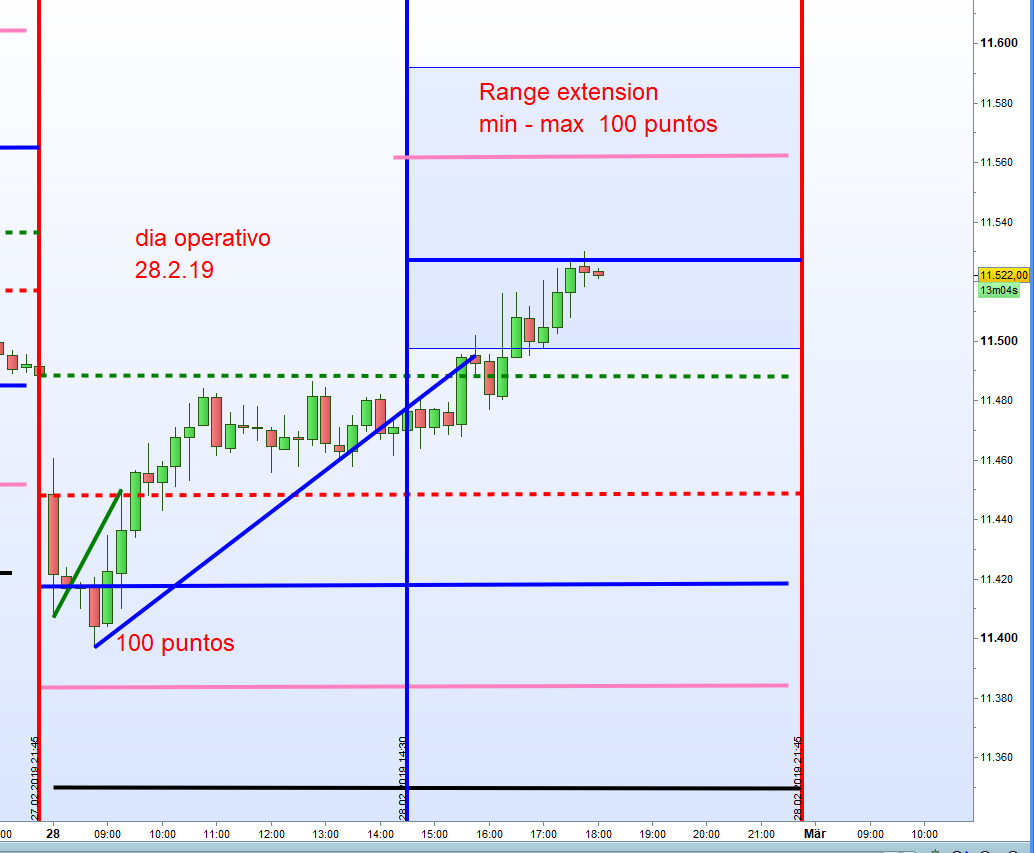 Extension de rango: He decidido que lo operamos con una diferencia entre min y max del rango de por lo menos 100 puntos. Vea grafico de hoy.