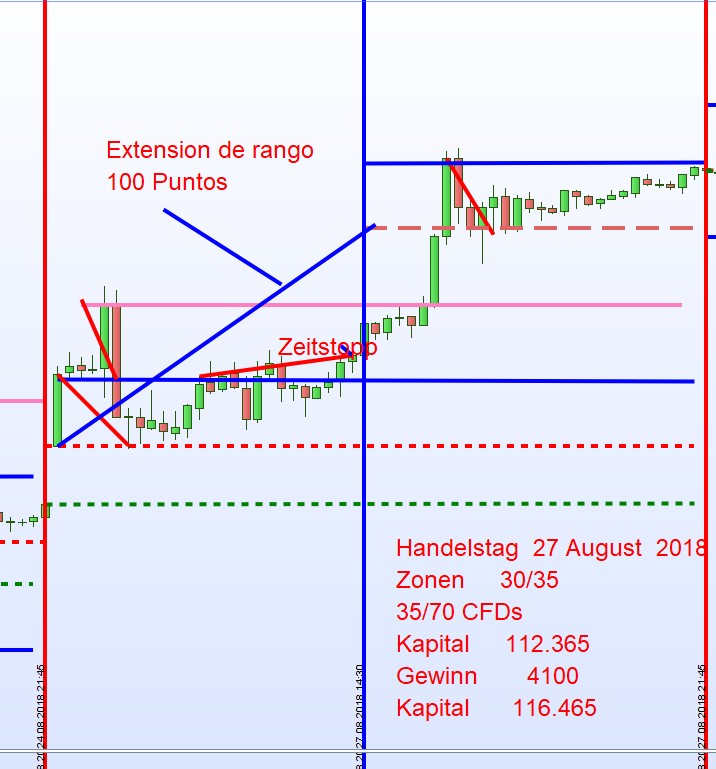 La extension de rango empieza al minimo o maximo del dia siempre que el rango sea por lo menos 100 puntos. Si esto no es el caso se mide los 100 puntos vea grafico 27 de agosto 2018 adjunto. Tradear la extension de rango no es tan facil que parece pues a partir de las 14:30h mandan los DJIA FUT. Hay unas reglas adicionales que las explicare caso por caso.