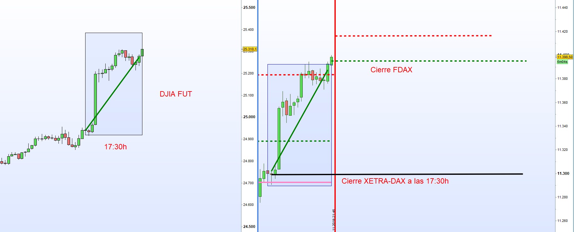 Mirad el grafico adjunto debida a la noticia de Powell de la FED los DJIA FUT suben y el FDAX en unisono.