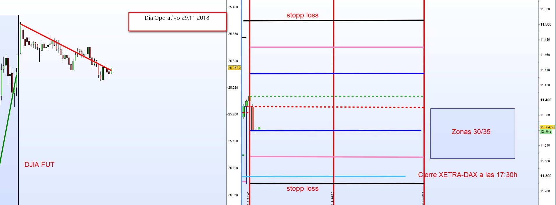 Muchos tienen otro Broker y por consecuencia un cierre y apertura ligeramente diferente. Para no entrar en estas diferencias presento los resultados con el grafico del FDAX. Las lineas de las zonas son orientativas y si uno ha entrado un poco debajo o encima y tiene como Take Profit 30 Puntos enhora buena. Por contrario no se deja correr una posicion en perdida porque no ha alcanzado exactamente la meta.