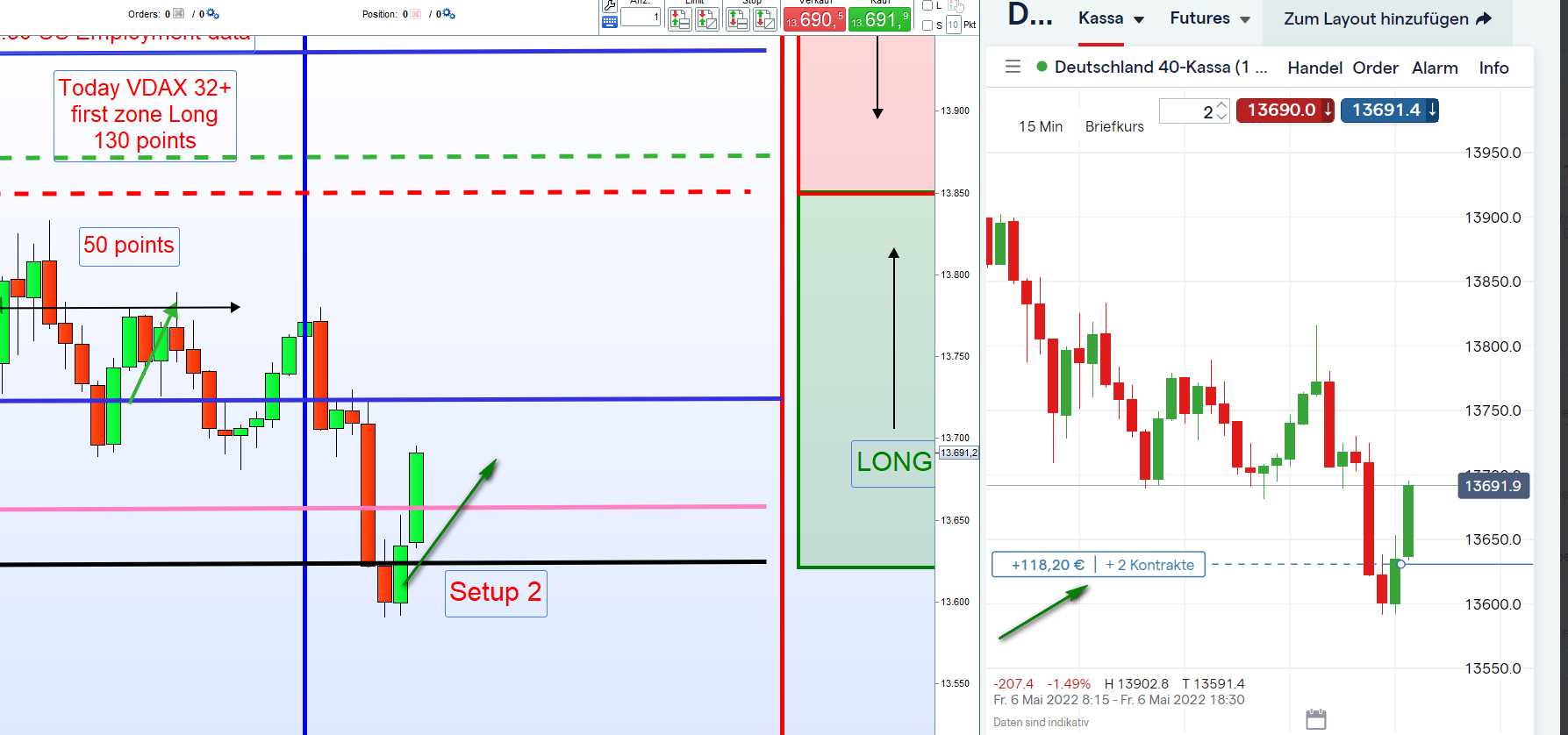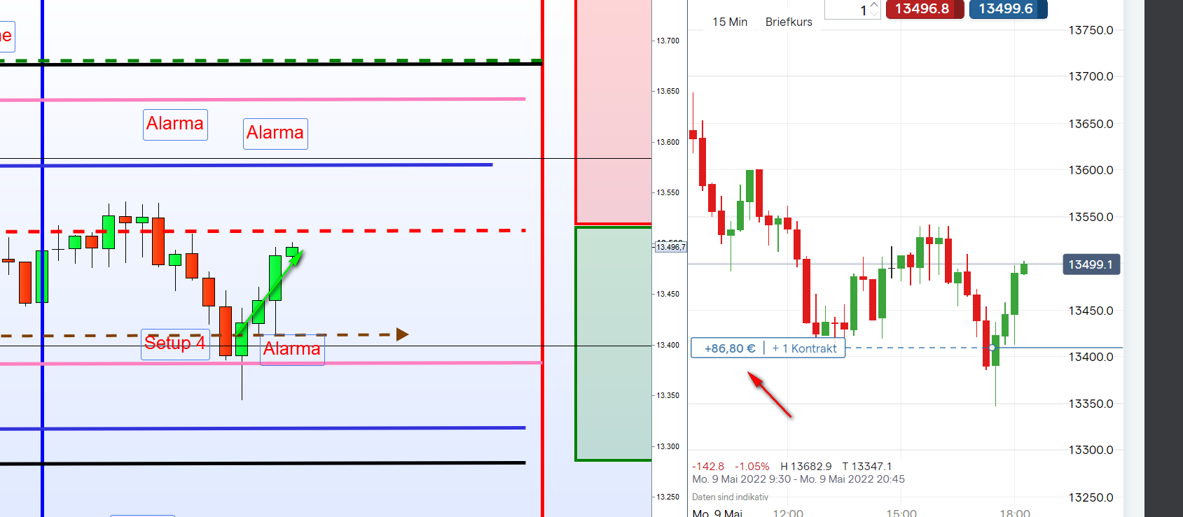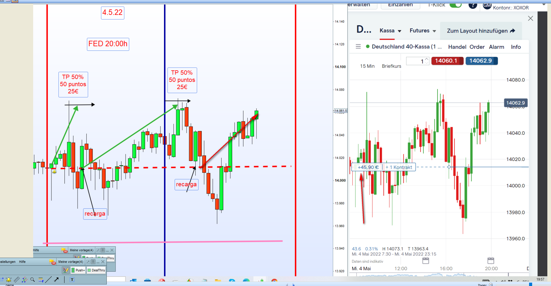 Adjunto la operativa de los dos ultimos dias . El resultado max que uno puede haber obtenido desde el 29.4.22 serian 1.414€. Han sido dias que todo funcionaba segun las reglas de la FDAX-TRADING-STRATEGIE.