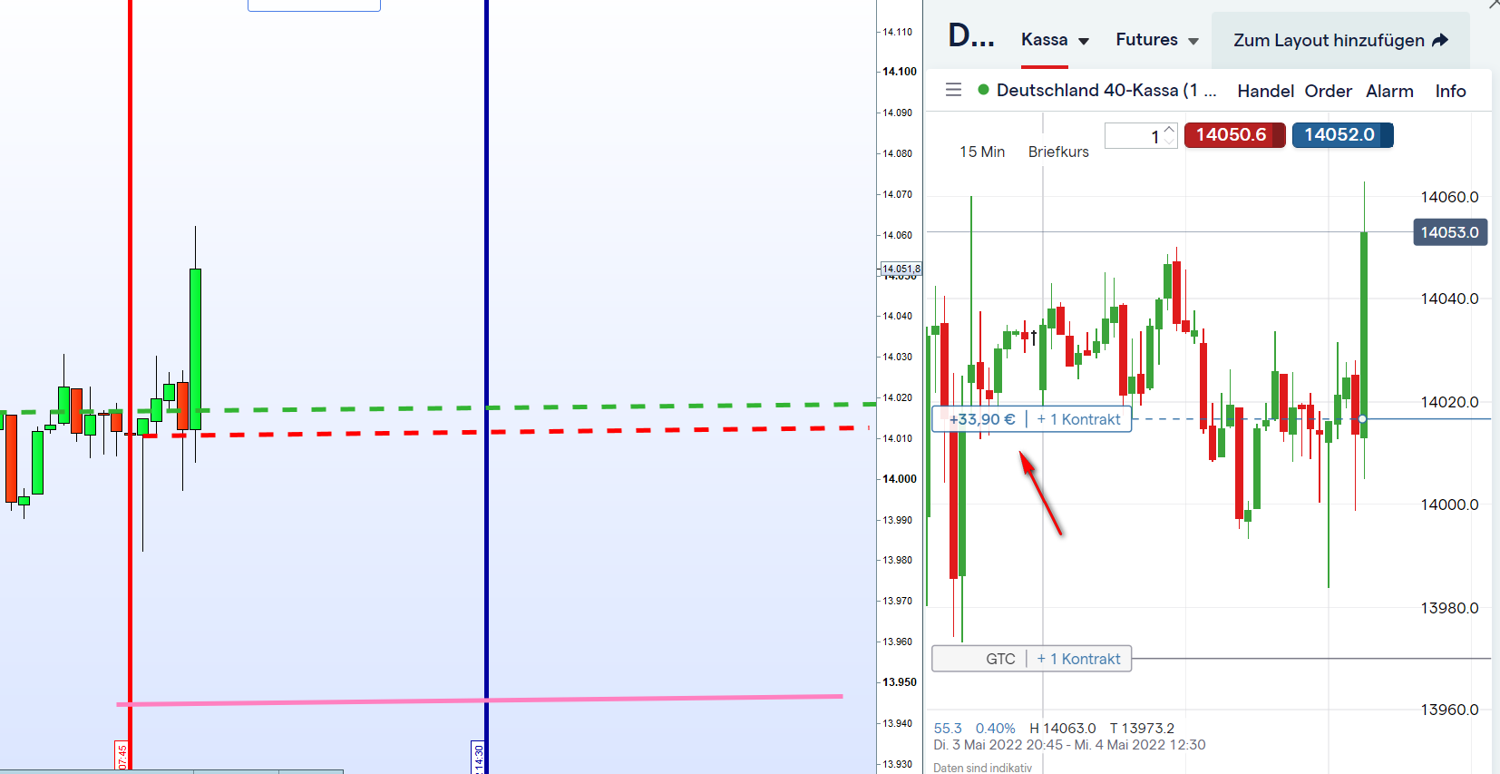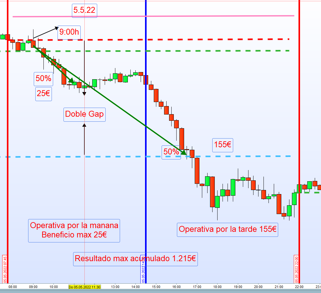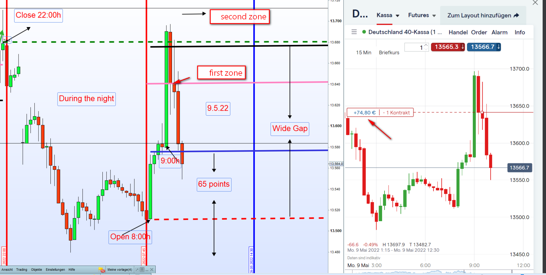 Adjunto la operativa de los dos ultimos dias . El resultado max que uno puede haber obtenido desde el 29.4.22 serian 1.414€. Han sido dias que todo funcionaba segun las reglas de la FDAX-TRADING-STRATEGIE.