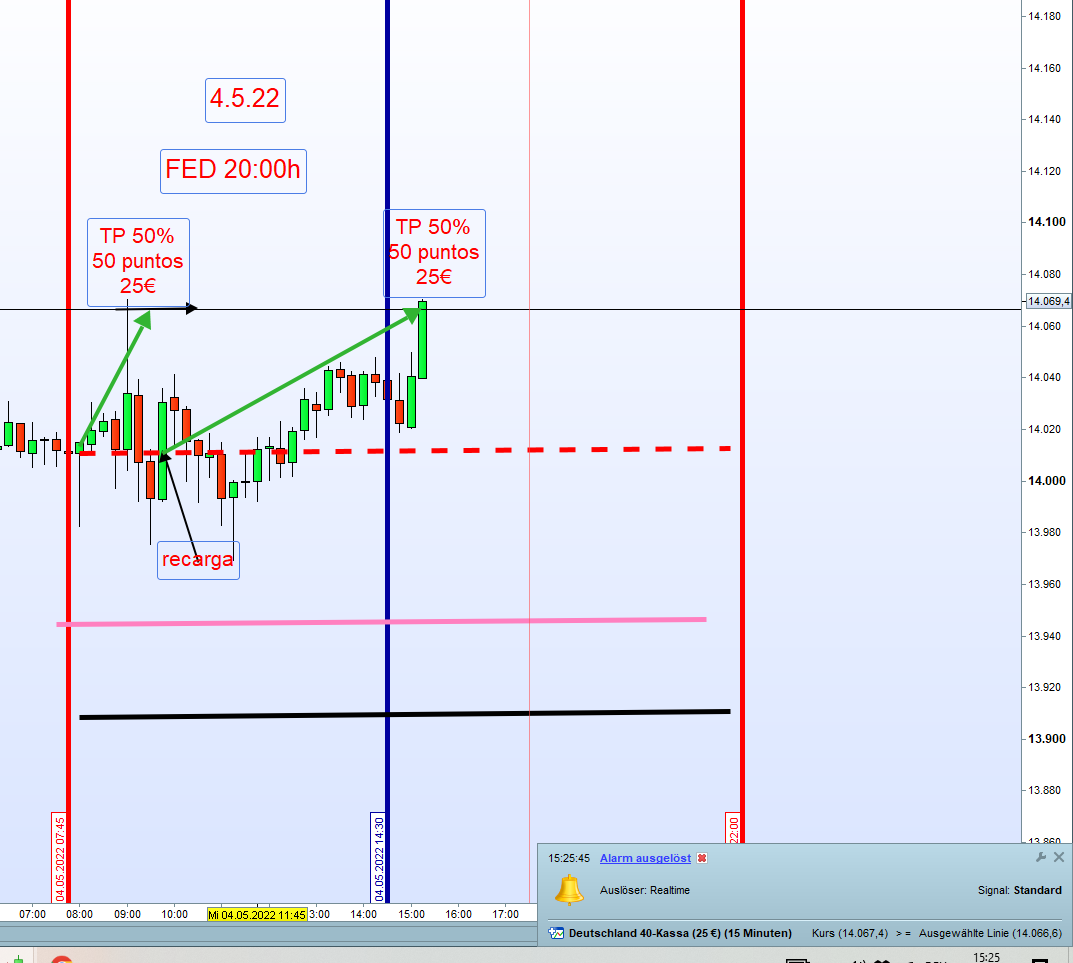 El mangement de la posicion es tal que se toma un beneficio parcial de 50 puntos y dejar correr el resto del 50%a ser posible hasta que alcance el cierre del DAX del dia anterior lo que acaba de hacer.