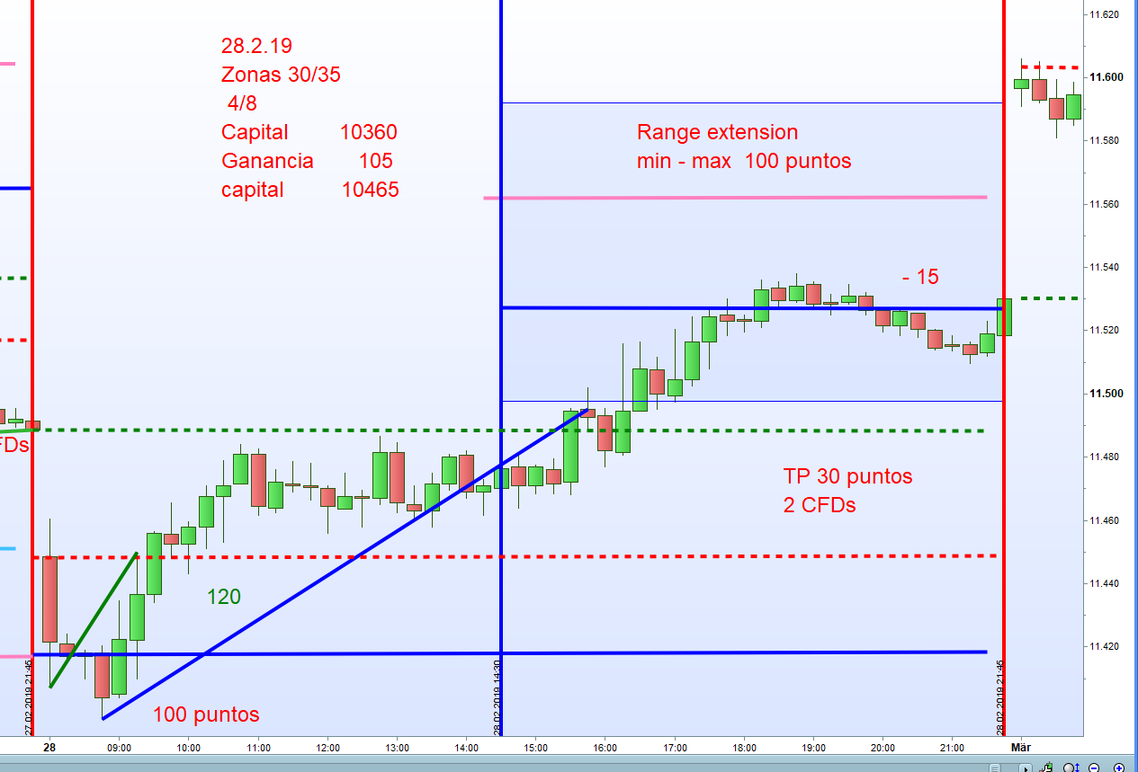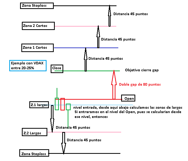 Yo entiendo que si se entra al nivel de la apertura el objetivo es el cierre del gap o los 60 puntos (caso de ser un gap de + 100 puntos). En el caso que la entrada se haga separado del nivel de apertura por esperar confirmación con Dow +-1%, desde el nivel de entrada en contra del gap, se marcaran las zonas correspondientes a la distancia según volatilidad.