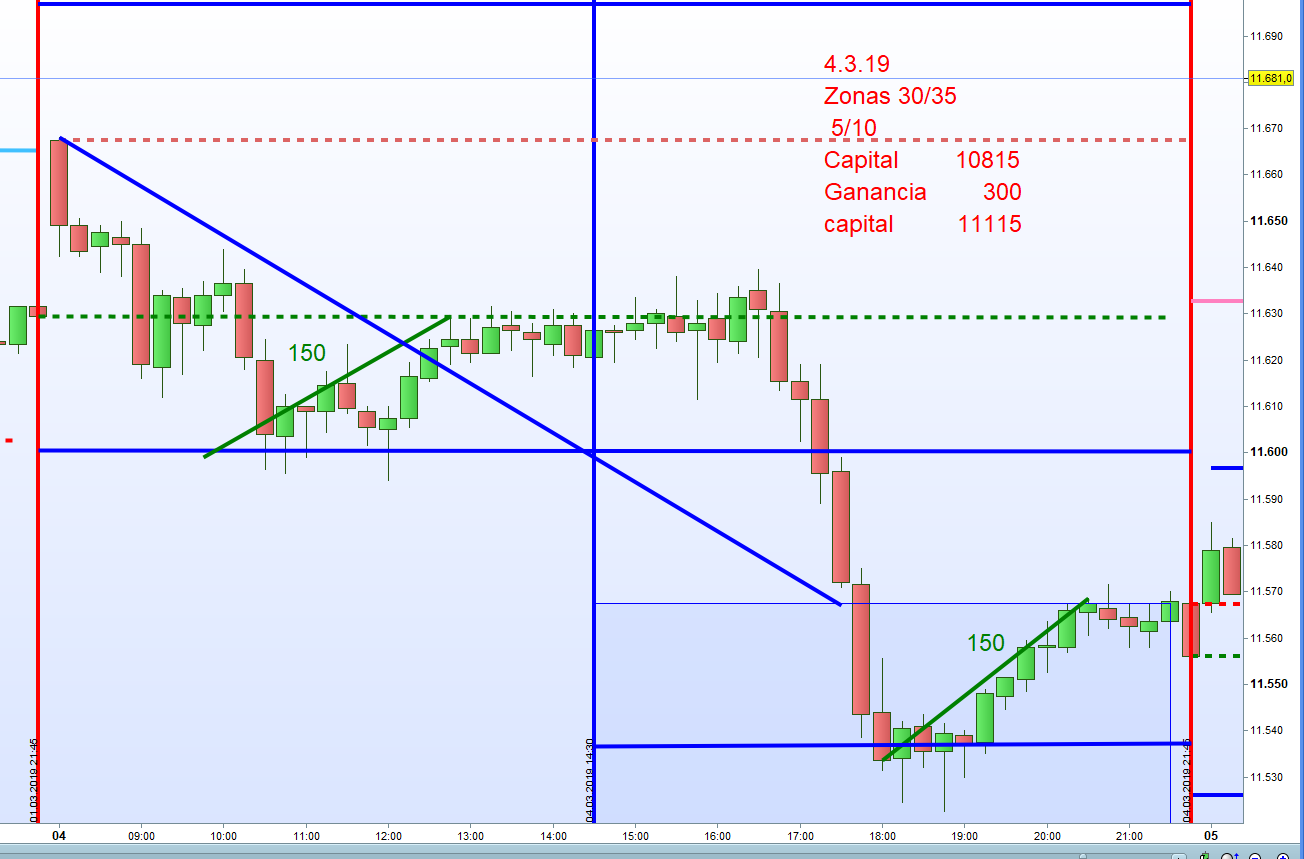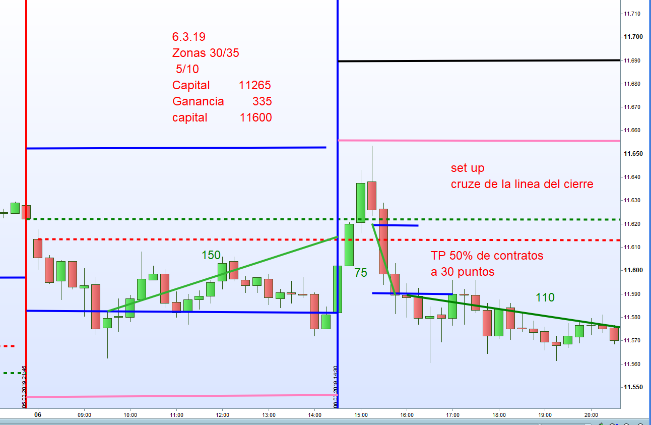 Debido al aumento de contratos con el dinero ganado y los nuevos set ups por la tarde el beneficio son 1650€ lo que nos permite de aumentar los contratos de 5/10 a 6/12.