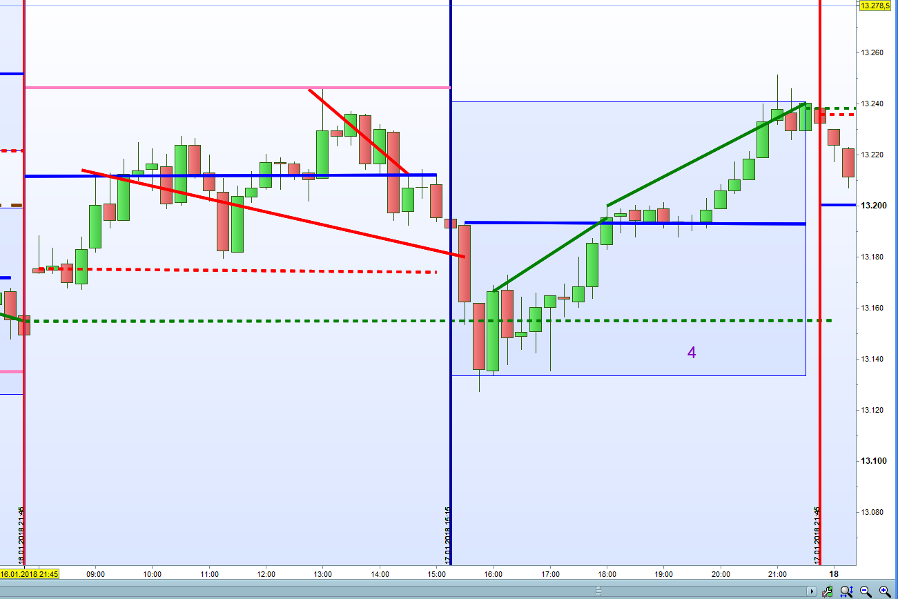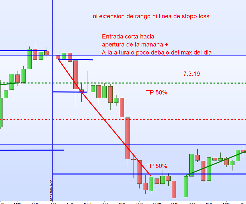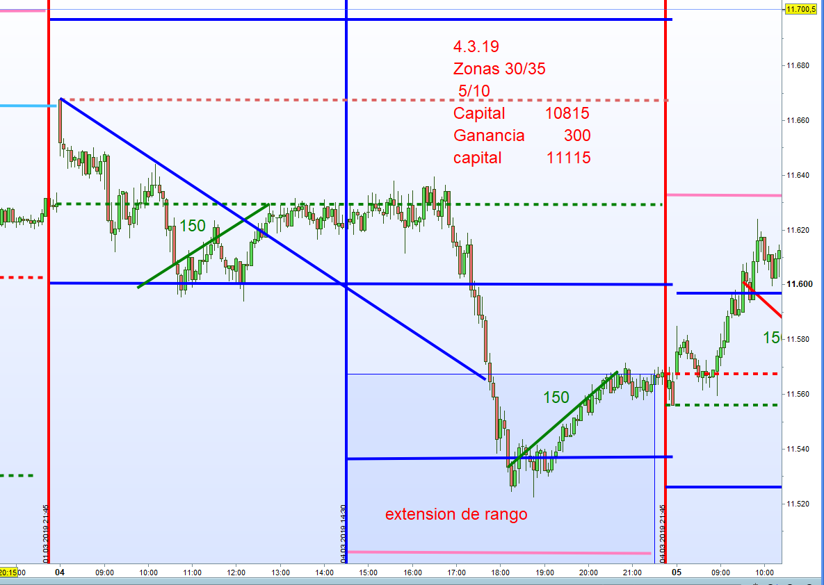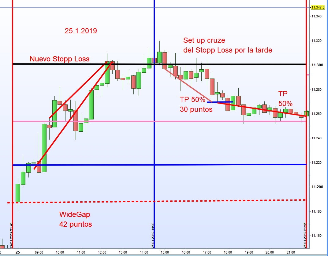 A continuacion graficos recientes de los cuatro set ups de la posible operativa por la tarde siendo la mas frecuente: Extension de rango, set up cruze del cierre del dia anterior, set up operar en direccion de la apertura y cruze linea del stopp loss. En total un arsenal operativo muy potente con alta fidelidad.GeorgM escribió: 09 Mar 2019 19:40 He publicado ya el grafico adjunto con las tres posibilidades de operar por la tarde mas el trading in direccion de la apertura que en total son cuatro. Interesante es de estudiar como se comporta el trading largo y corto del precio del XETRA-DAX del dia anterior.