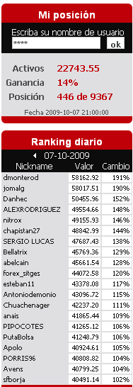 Te llevas sorpresas cuando ves en que opera la gente, prácticmente le dan a todo, cada uno especializado en una cosa. Hubo un ganador semanal en el 1º concurso, el que no tení porshe, que le pegaba duro al CORN, SYBEAN y todos esos CFD's que replican a los activos del CBOT y sacaba unas rentabilidades impresionantes.
