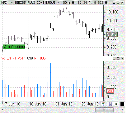 Comienzo haciendo una vista general. Espacio temporal 30min. Aquí voy buscando dónde entra el smart money, los leones o los hacedores de mercado, como queráis llamarlo. Busco las barras con ultra volumen.
