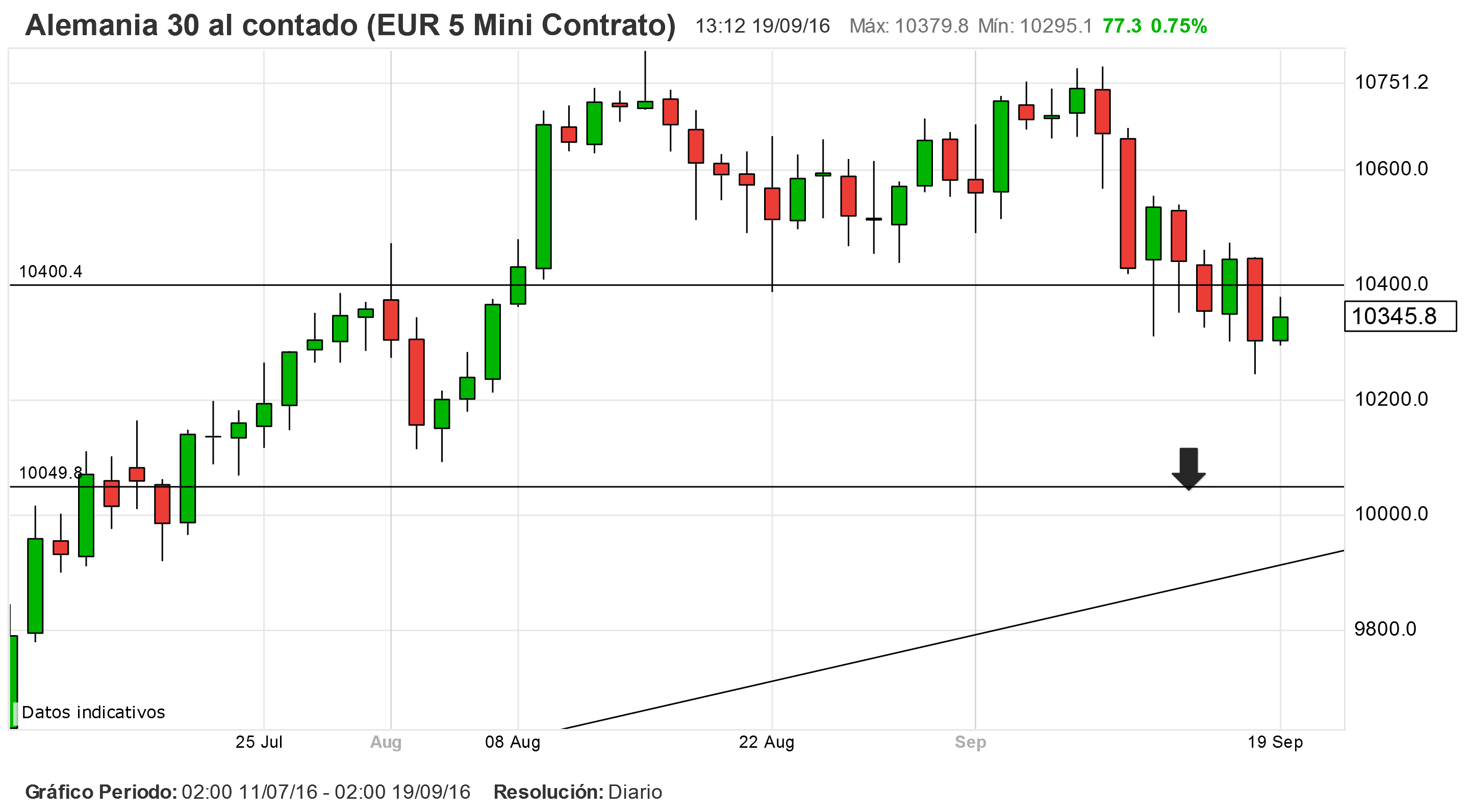 ahora vamos a ver en el grafico diario del Dax el doble techo, su ruptura en 10400 y su objetivo 10050