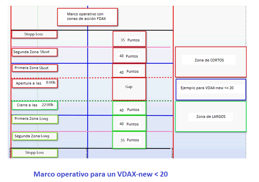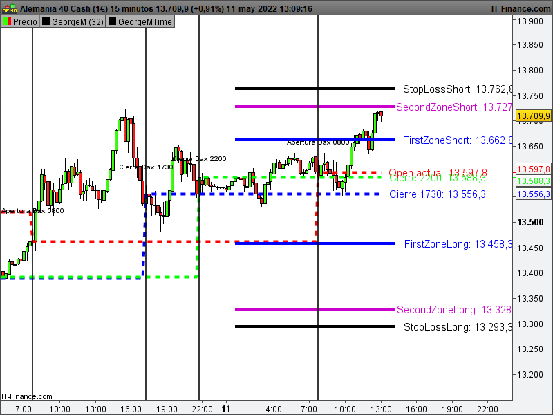Hace ya unos años que después de vagar por varias plataformas estoy con Prorealtime y he realizado un indicador que voy a adjuntar para que dibuje las zonas automáticamente, solo tienes que introducir el valor del VDAX a primera hora de la mañana. En principio es muy básico, compruébalo si te puede servir y si funciona de manera correcta. Aún no he incluido ( lo intentare más adelante, para que tenga en cuenta los gaps), Por supuesto me he permitido la licencia de llamarle GeorgeM. También adjunto otro (GeorgeMTime) que se colocará también en el gráfico del precio para dibujar las líneas verticales que representan las horas importantes).