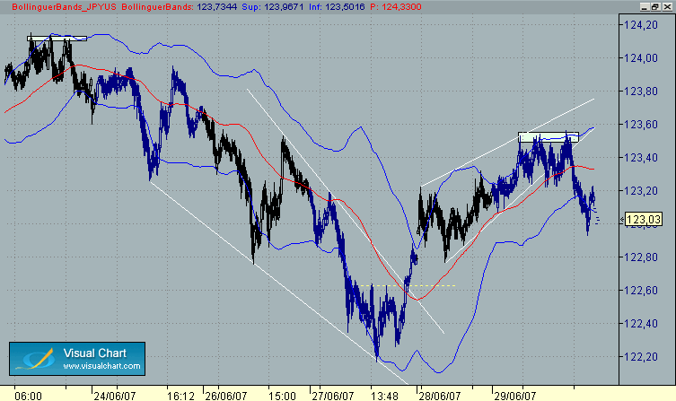 bueno la conclusion a la que llego es que por supuesto hay que seguir el precio de cerca porque no somos adivinos, pero lo que digo, es que "si se" que el precio tiene que caer pero no se cuando, mi obligacion es hacer operaciones swing largos y cortos, sabiendo que uno de esos cortos o unos de esos largos (menos probable) se ira por un lado de las bandas de bollinger en 240....hay que operar segun nos diga poco a poco....el problema entra en la psicologia, los retrocesos, las voladuras de stops, los objetivos a las bandas y señales rsi que le trader no interpreta bien o son imperfectos....jejeje vaya todo un arte...solo queria dejar mi analisis de lo que haria.