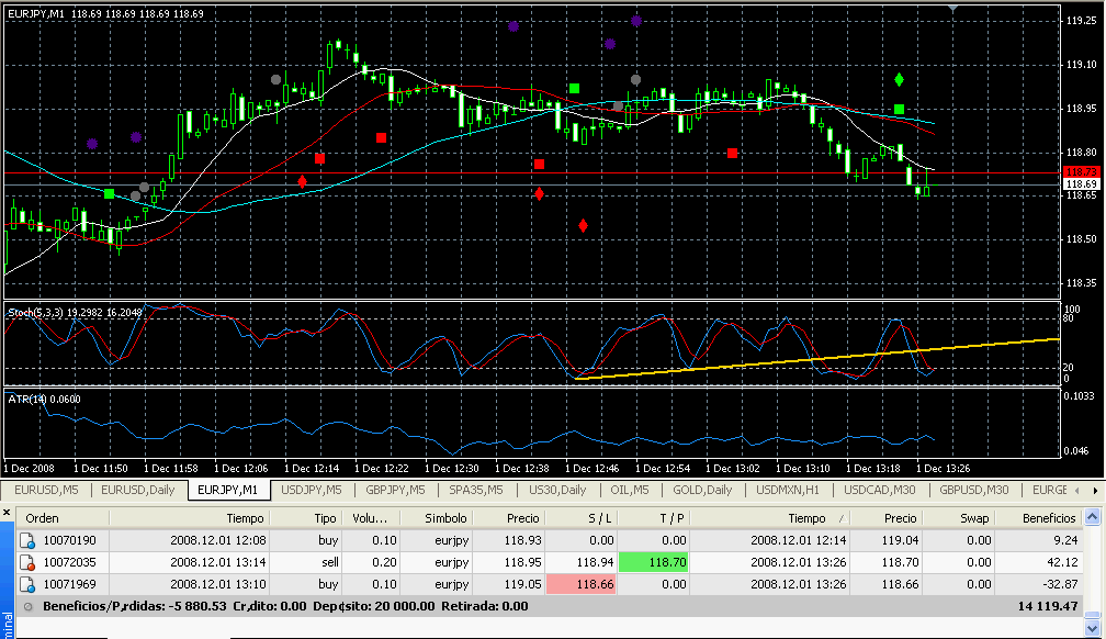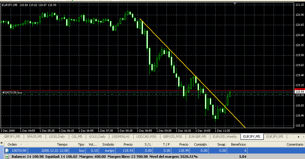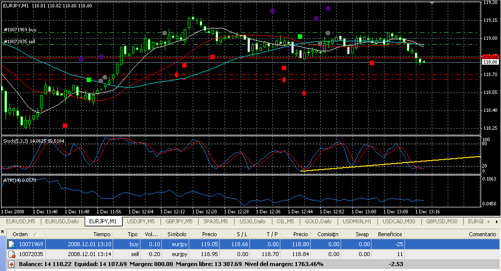 Lo que quiero es llegar pronto a situaciones de riesgo, por eso acorto los objetivos para que esté obligado a sumar lotes lo más rápido posible.TapeFighter escribió:¿Movimientos de 10 pipos? ¿No convendría poner objetivos más grandes (véase 20-50)?Spirit escribió:Comenzamos la fiesta![]()