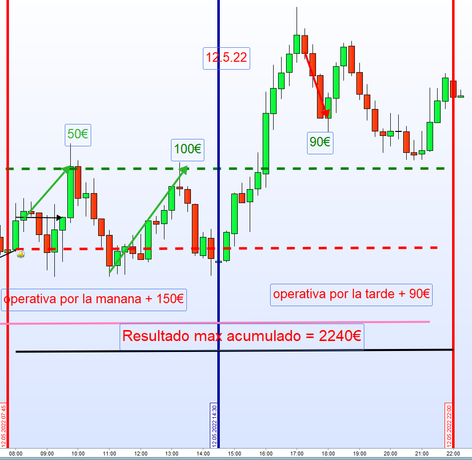 La estrategia aclara que es para situaciones en las que los índices cotizan por debajo del 0.5% y mi duda es si deberíamos interpretar que también puede ser aplicada para momentos en los que los índices cotizan por encima del 0.5%. Este punto podría ser interesante para aplicar a la operativa de hoy 13/05/22 08:00 en el caso que a las 8:00, los futuros del DOW cotizasen por encima del 0.5%