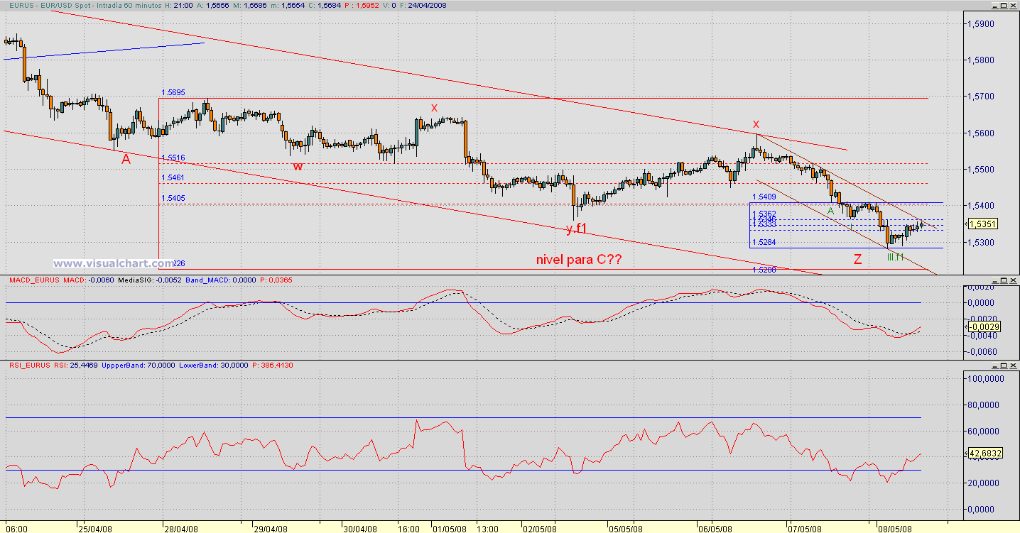 [/url]Charteista alabo tu iniciativa pero... si te mojas un poco más con tu análisis la próxima vez no creo que te arrugues, eh?, que pegar un gráfico con unas medias pues... eso y nada...A ver, hay va uno. Yo vigilaría de cerca el 5360 (0,6 de onda III de c de Z) y si da señales de vuelta pues a abrir el corto. Sería el comenzo de la onda 5 de c de Z de C o sea último impulso bajista con objetivo 5260-5225, antes de iniciar una notable corrección alcista.