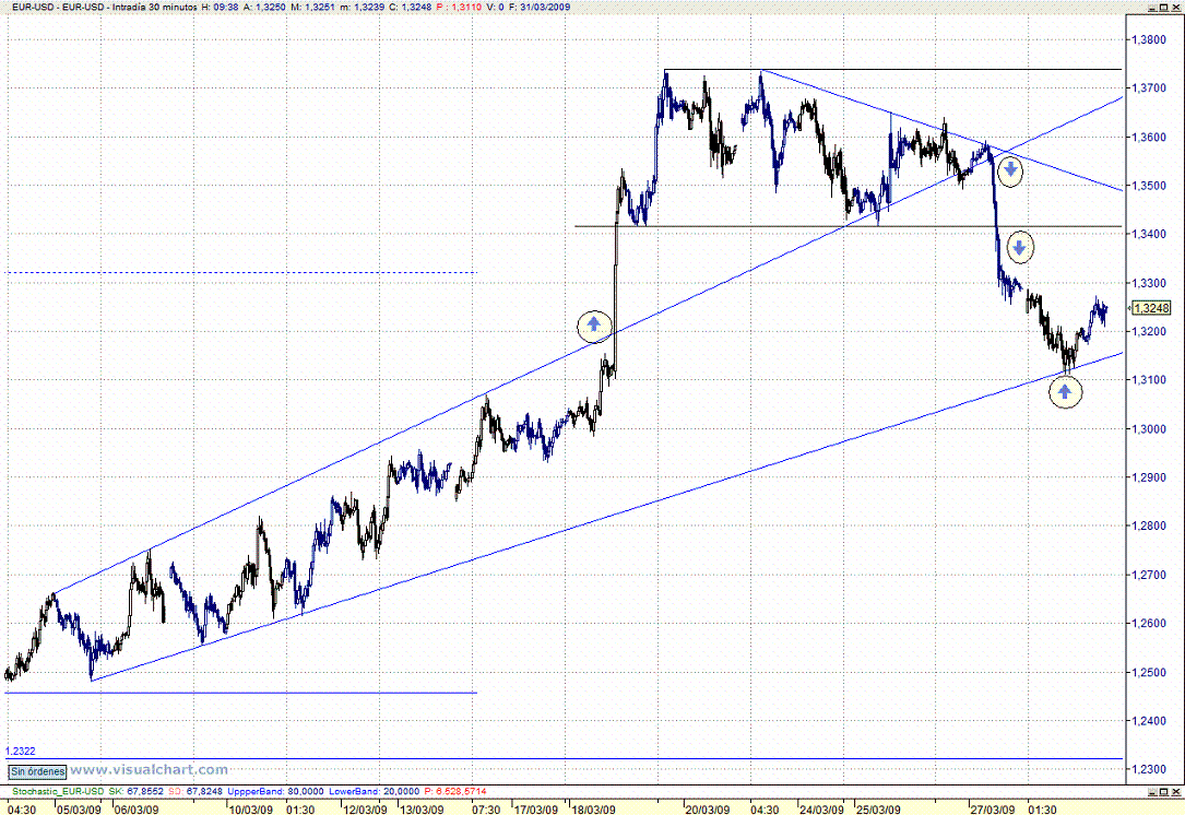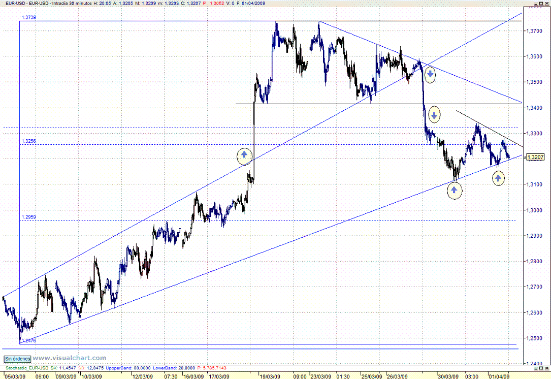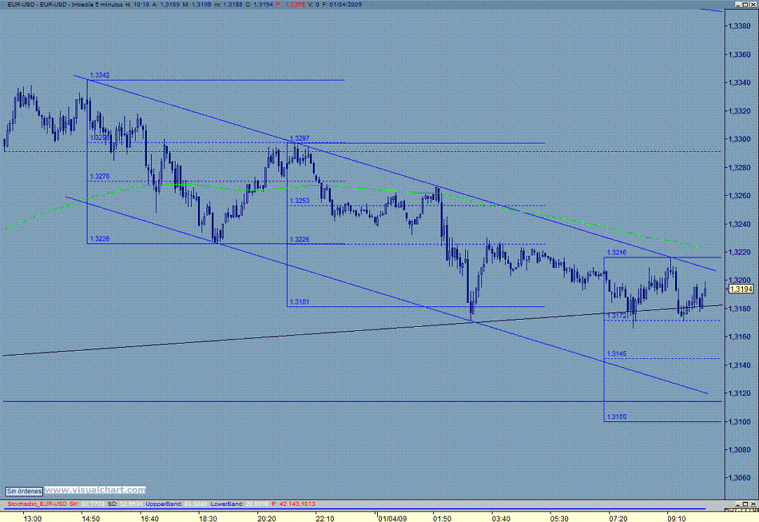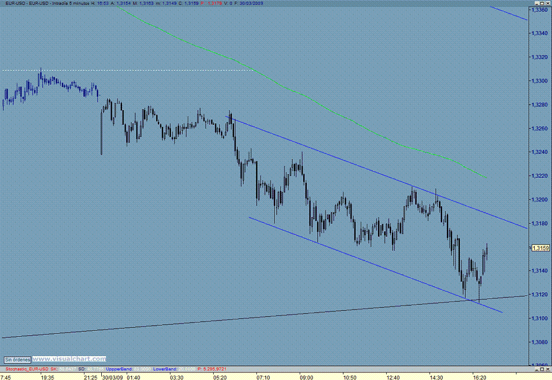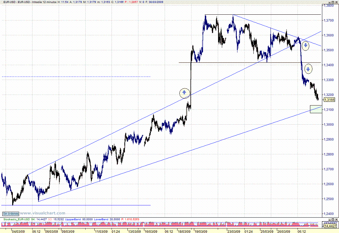 5 minutos, se ve esa pequeña tendencia bajista comentada en el otro gráfico que marca un canal perfecto, cuidado si no puede con ella pq seguirá dentro de este canal bajista y perderá (momentaneamente o no) la tendencia alcista iniciada desde 1.24 (color negro).
