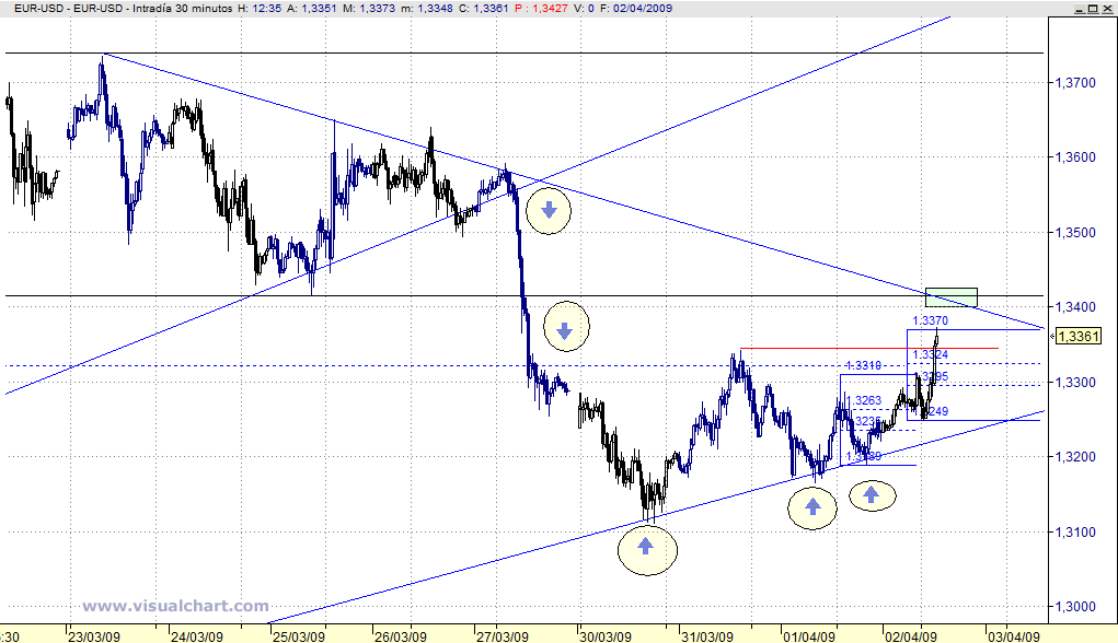 Rebotó en la zona marcada en el gráfico anterior, el primer objetivo del rebote esta cerca del 1.33